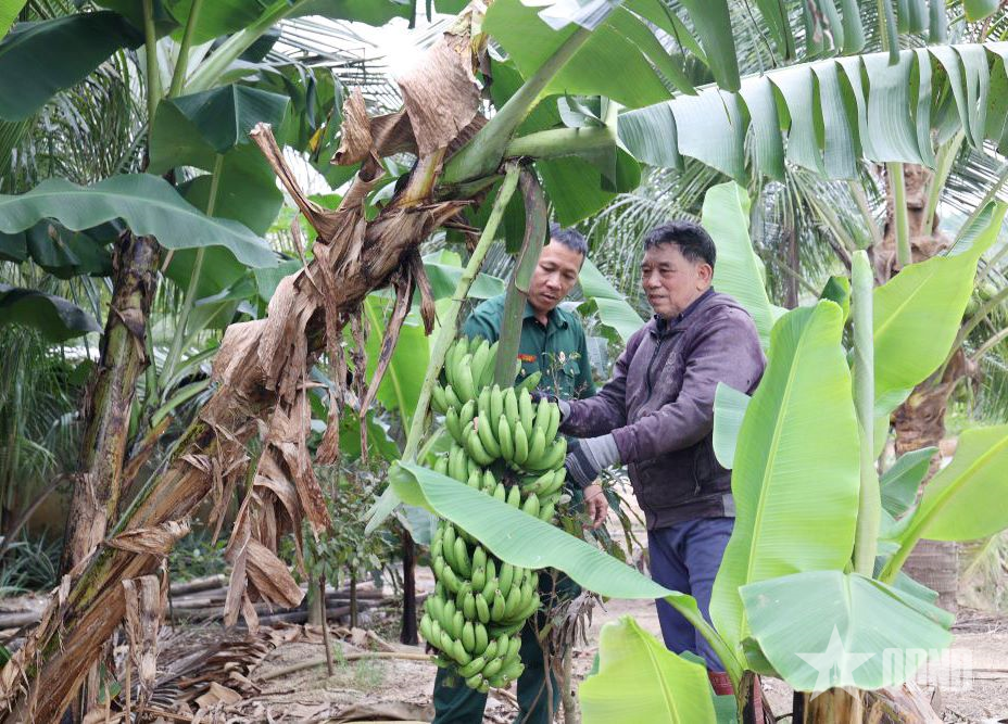 Đồng chí Lê Văn Tự, Chủ tịch Hội CCB xã Suối Dầu và CCB Lê Quang Dưỡng bên cây chuối tiêu trĩu quả.