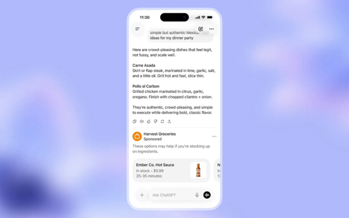 Điểm đáng chú ý là quảng cáo sẽ xuất hiện ngay bên dưới câu trả lời của ChatGPT, thay vì ở dạng banner hay pop-up như các nền tảng truyền thống. OpenAI cho biết các nội dung quảng cáo sẽ được gắn nhãn rõ ràng và không ảnh hưởng đến cách ChatGPT trả lời câu hỏi.