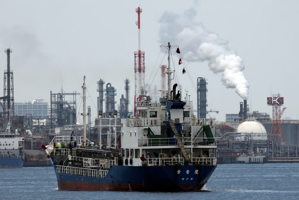 Tàu chở dầu di chuyển gần một nhà máy lọc dầu trong Khu công nghiệp Keihin ở Kawasaki, phía nam Tokyo. Ảnh: Reuters.