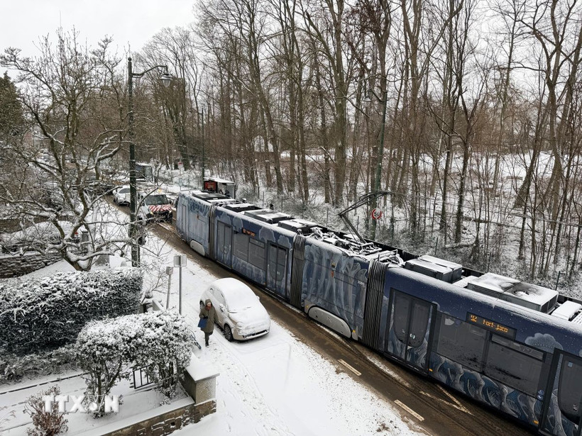 Một tuyến tàu điện ở Brussels bị đình trệ do băng tuyết hôm 7/1. (Ảnh: Hương Giang/TTXVN)