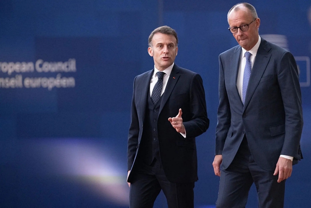 Tổng thống Pháp Emmanuel Macron và Thủ tướng Đức Friedrich Merz đến dự hội nghị tại trụ sở Liên minh châu Âu ở Brussels ngày 19/3/2026. Ảnh: John Thys/Getty Images