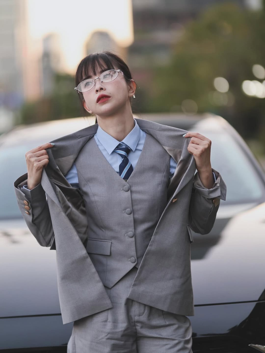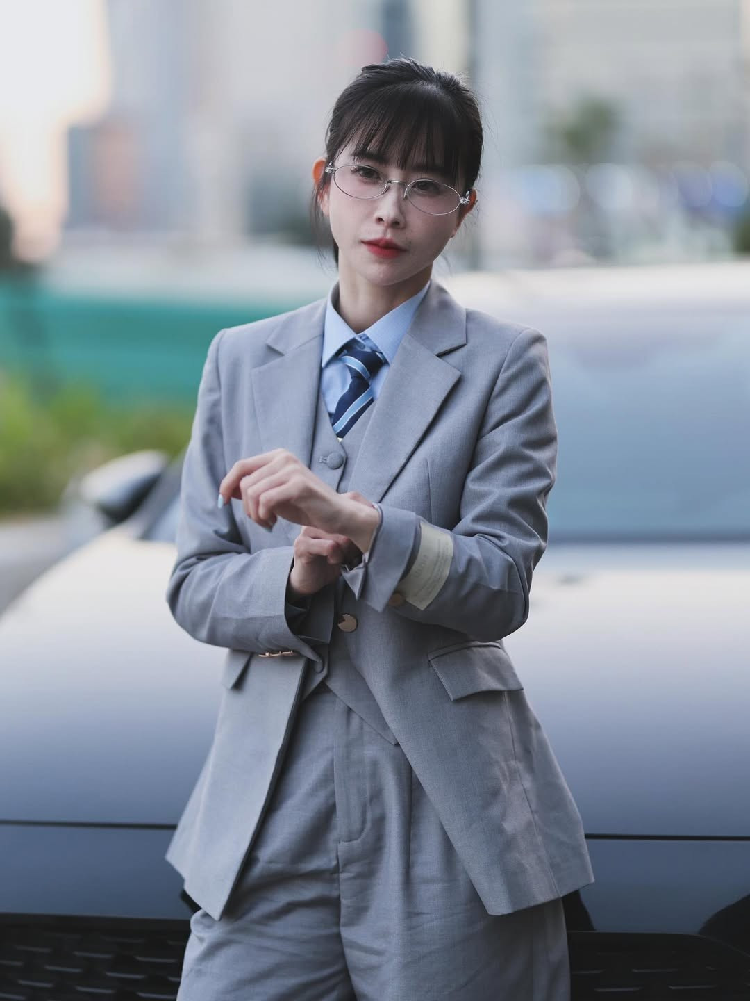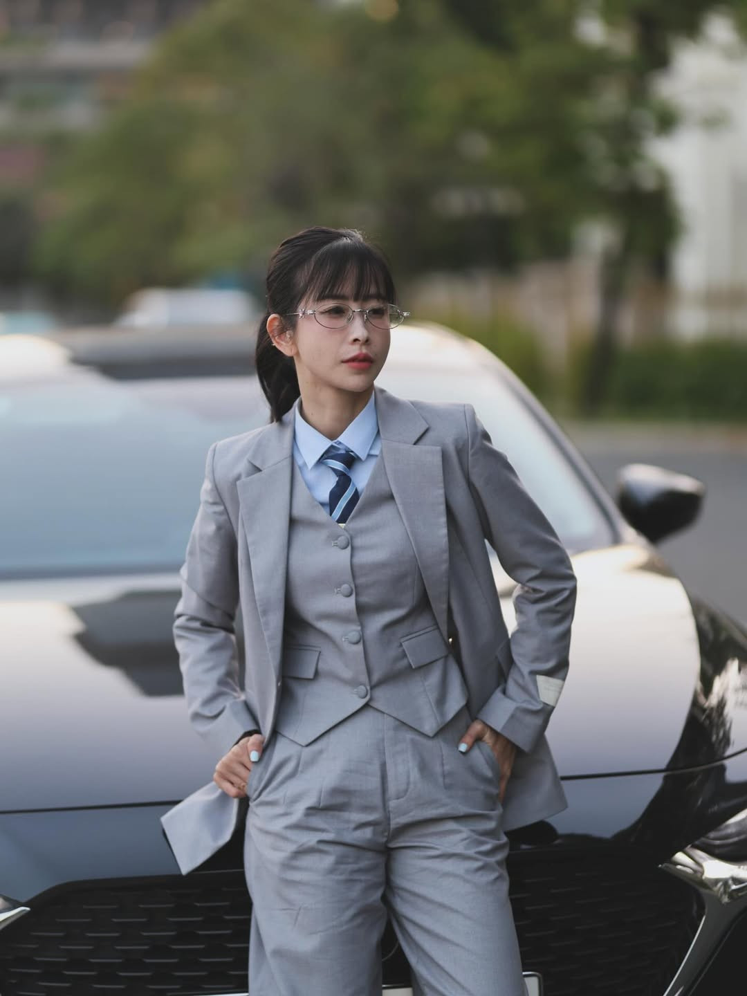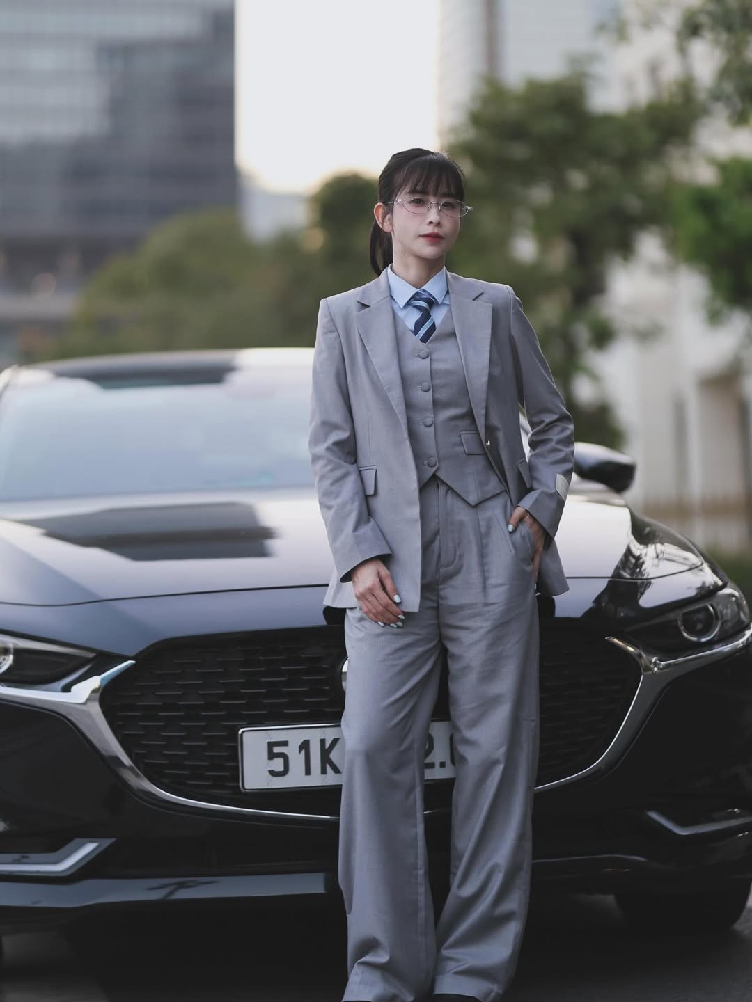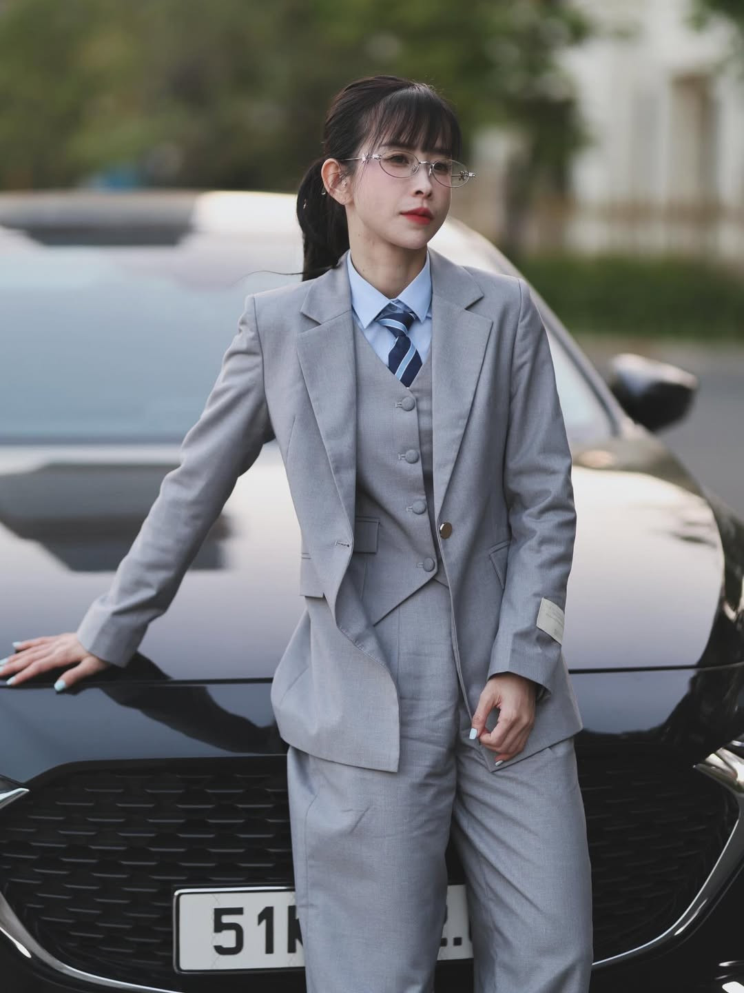 Trong loạt ảnh được chia sẻ, Châu Tuyết Vân diện bộ suit xám form đứng, phối cùng sơ mi xanh nhạt và cà vạt tối màu. Thiết kế tối giản giúp tôn dáng người gọn gàng, cao ráo, đồng thời làm nổi bật phong thái tự tin, quyền lực.