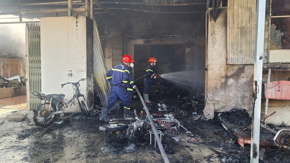 Tại hiện trường vụ cháy, tầng 1 được chủ nhà làm nơi sửa chữa xe máy, thời điểm xảy ra hỏa hoạn đang có khoảng hơn chục chiếc xe máy các loại, cùng khá nhiều phụ tùng, phục vụ công tác sửa chữa đã bị lửa thiêu rụi.