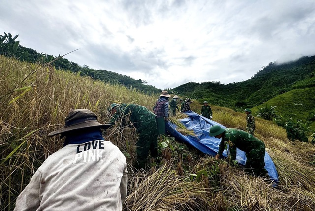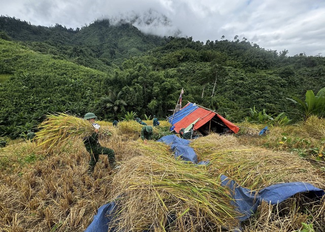 Trước tình hình cấp bách, các chiến sĩ đã gặt và vận chuyển lúa về nơi khô ráo, giảm thiệt hại do ngập úng.
