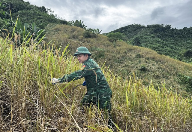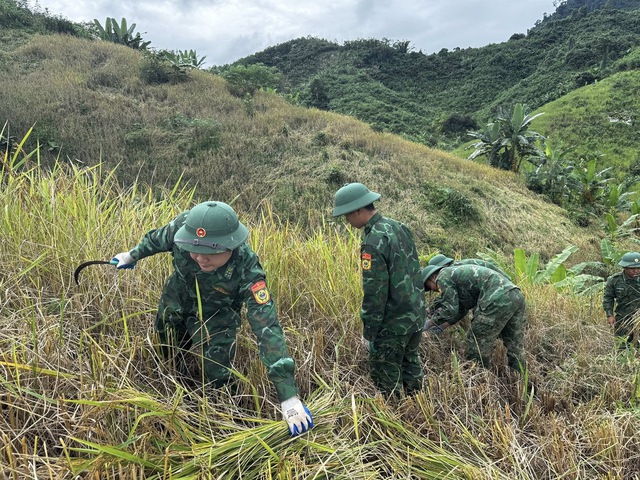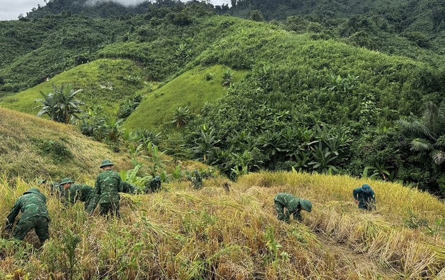 Tại xã La Êê, hàng chục cán bộ, chiến sĩ thuộc Ban Chỉ huy Phòng thủ khu vực 2 - Thạnh Mỹ có mặt tại thôn Pà Lan và BLăng để hỗ trợ người dân thu hoạch nhanh diện tích lúa rẫy đã chín.