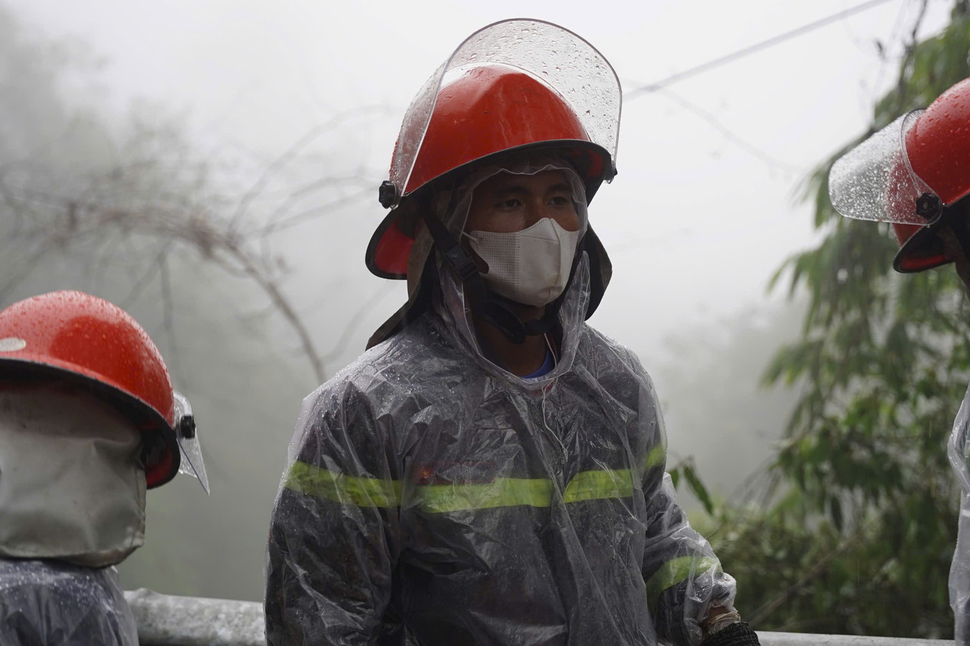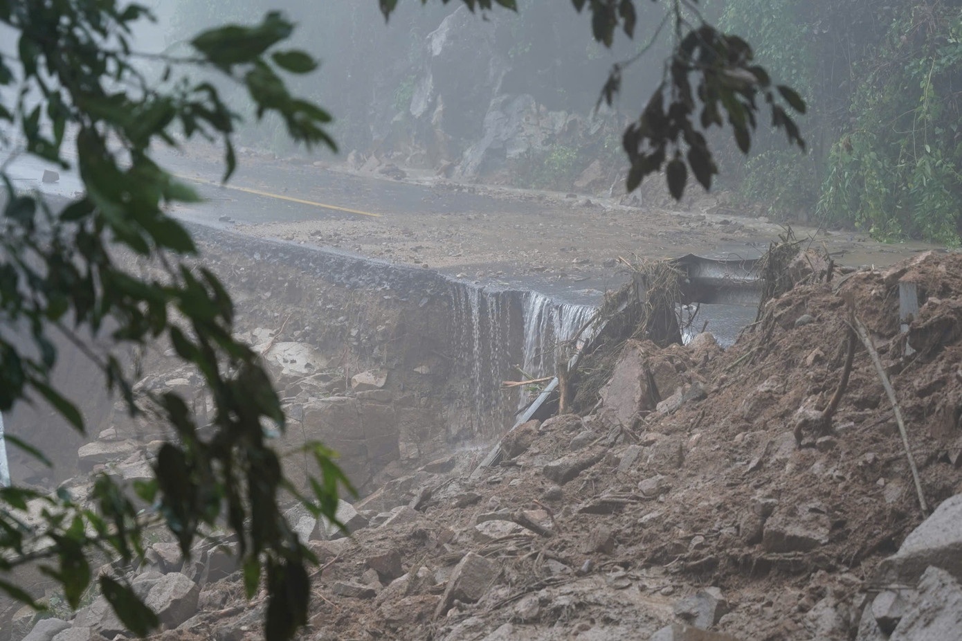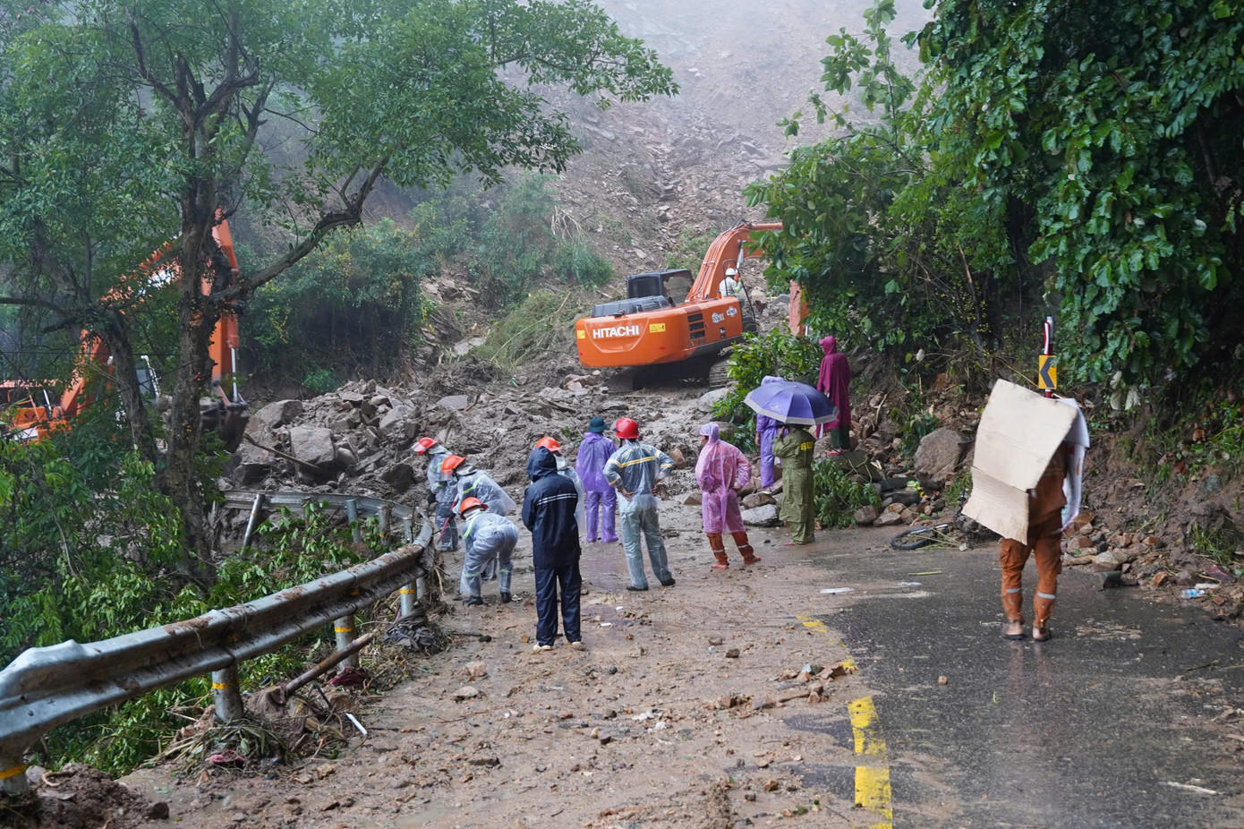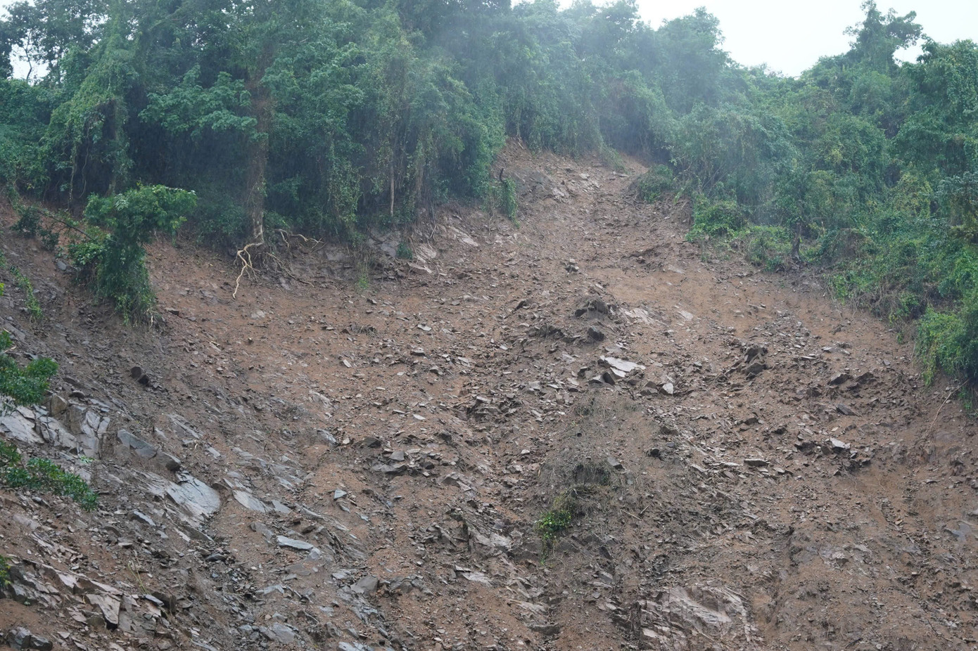 Tại hiện trường có hàng ngàn tấn đất đá bị sạt lở, tràn xuống đường. Chính quyền lập chốt, không cho người dân đi lên núi.