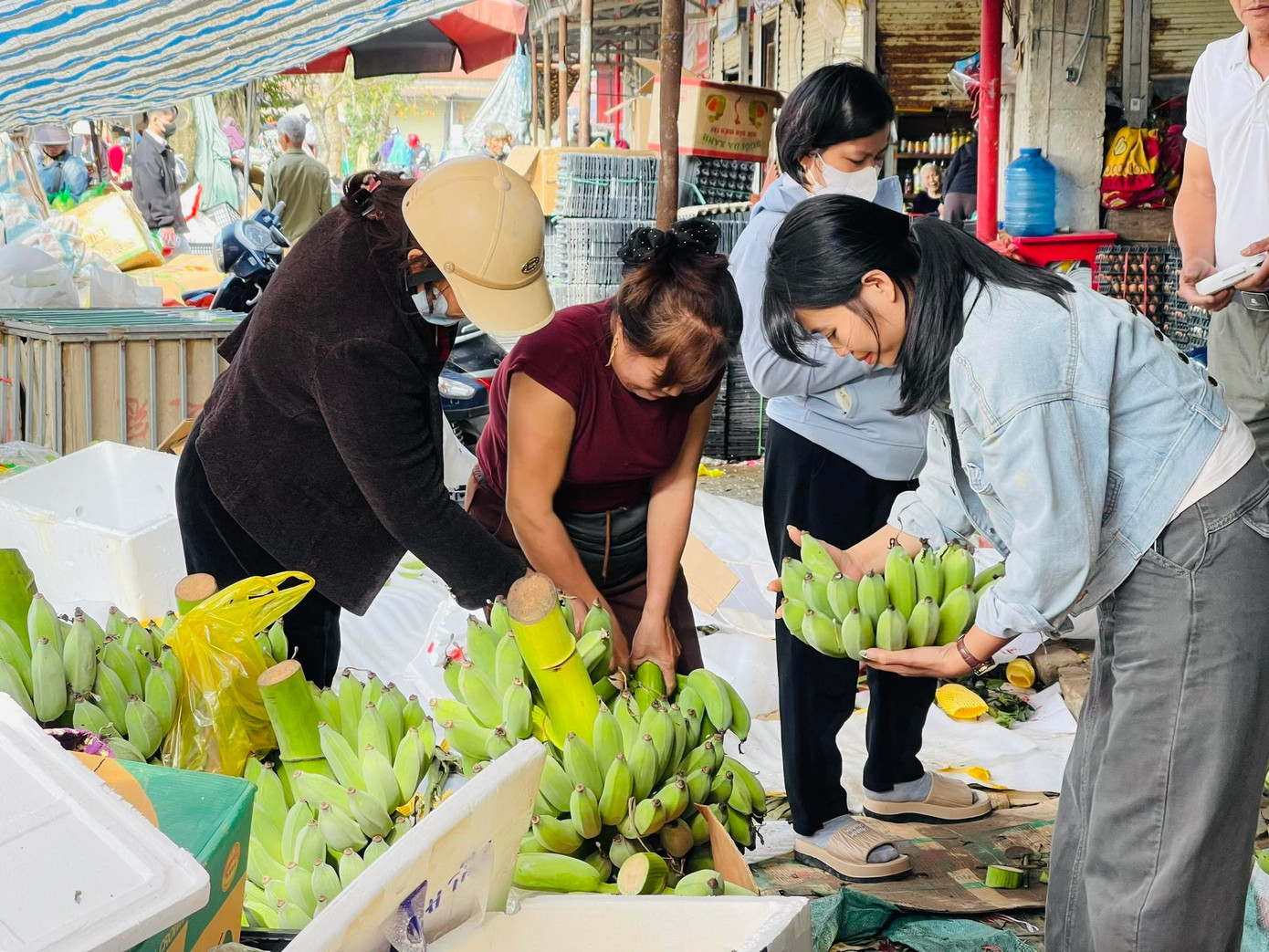 Không khí mua bán diễn ra khẩn trương khi ai cũng muốn chọn được nải chuối ưng ý trước khi nguồn hàng khan hiếm. Theo các tiểu thương, năm nay chuối chủ yếu được nhập từ các tỉnh miền Bắc, song do ảnh hưởng của mưa bão cuối năm 2025, nhiều vùng trồng chuối bị thiệt hại nặng khiến sản lượng giảm đáng kể.