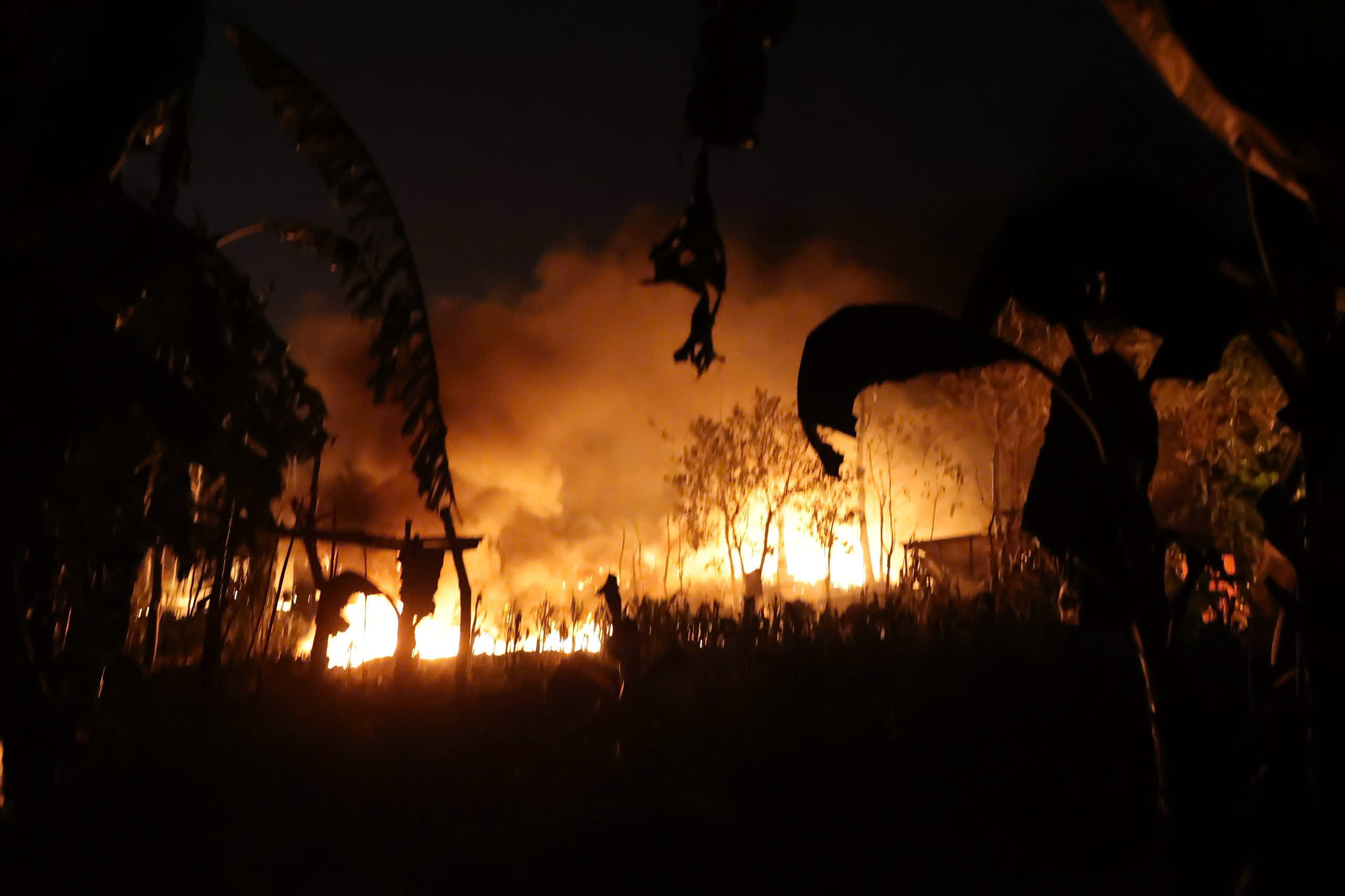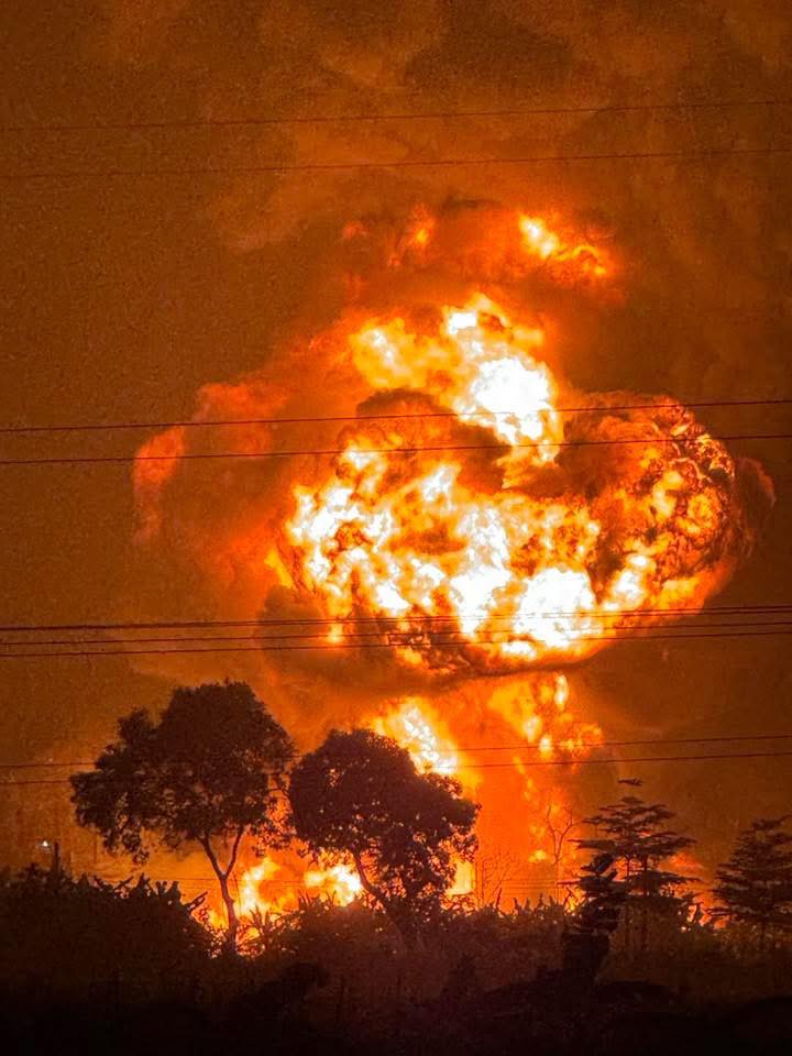 Từ xa, có thể nhìn thấy những cột lửa lớn bốc cao hàng chục mét, khói đen cuồn cuộn bốc lên dày đặc. Lửa bùng phát mạnh thành từng đợt lớn kèm theo nhiều tiếng nổ khiến người dân trong khu vực hoảng sợ.