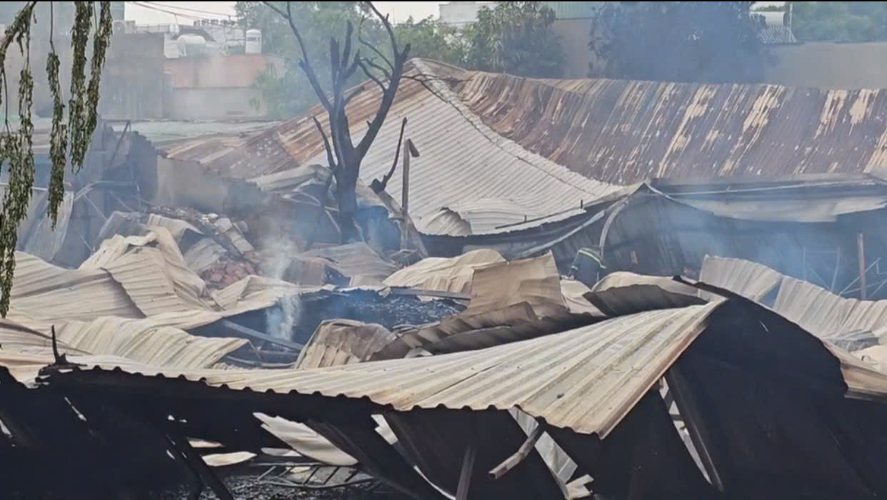 Vụ cháy làm nhà xưởng đổ sập, nhiều tài sản bên trong bị thiêu rụi. Ảnh: HC