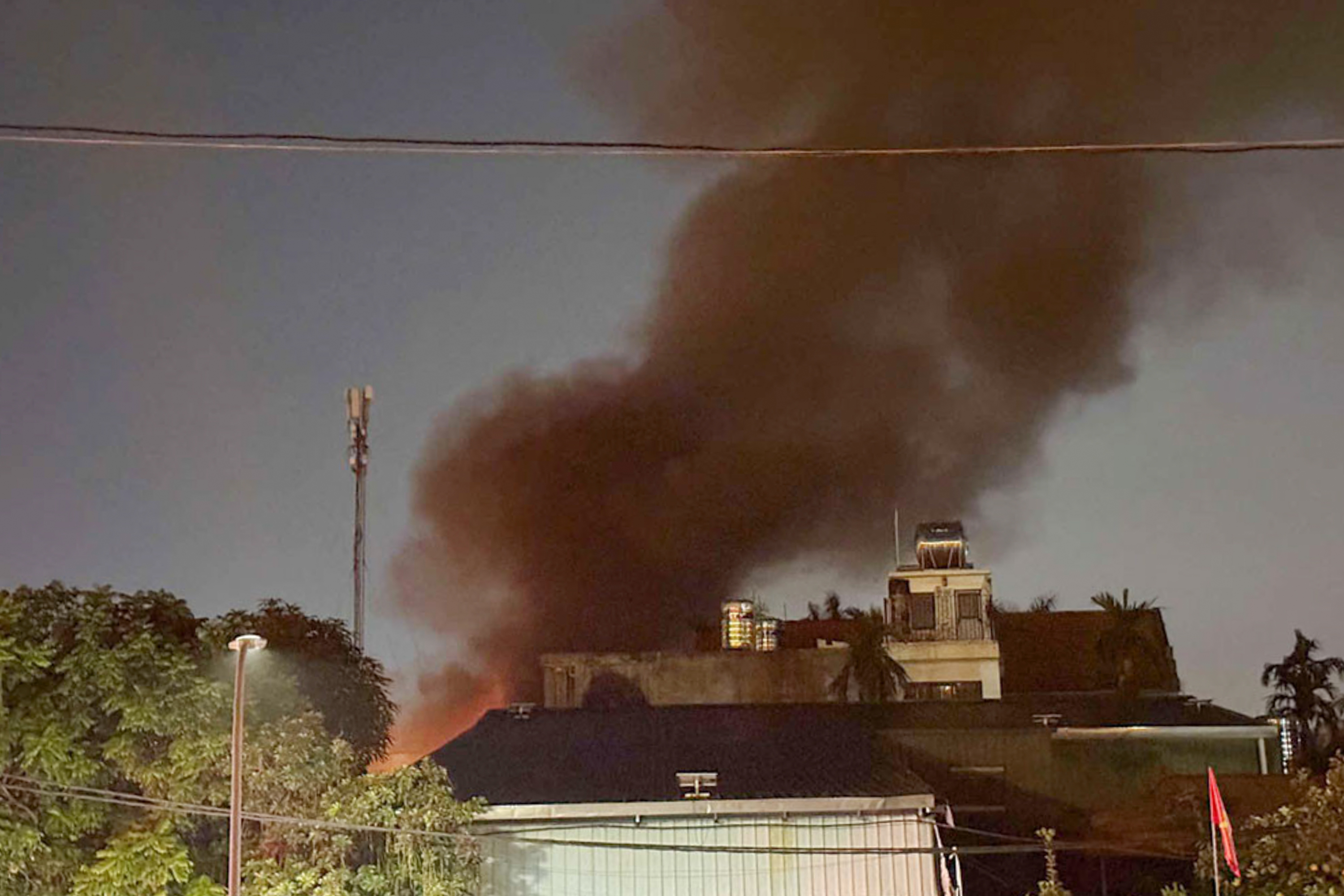 Theo nhân chứng, đám cháy xuất phát từ khu sản xuất đồ bảo hộ, sau đó lan nhanh khiến lửa bao trùm toàn bộ nhà xưởng. Cột khói đen đặc cuồn cuộn bốc cao, nhìn rõ từ xa. Nhiều người dân hốt hoảng di chuyển đồ đạc, tránh nguy cơ cháy lan sang khu dân cư liền kề.