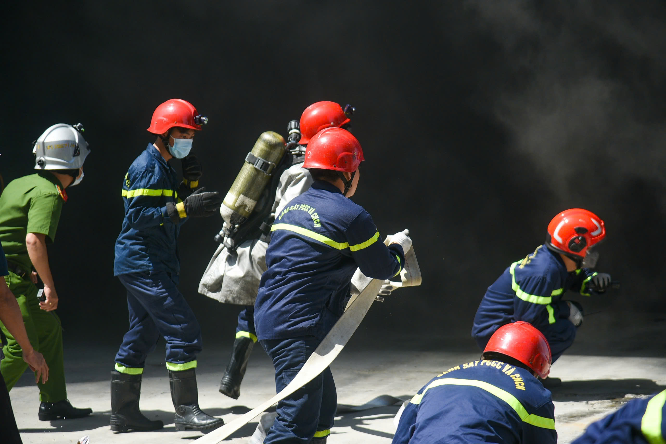 Tại hiện trường, cột khói đen cao hàng chục mét, bao trùm cả khu vực kèm mùi hắc bốc lên dữ dội. Các chiến sĩ phải sử dụng mặt nạ chống độc để tiếp cận khu vực cháy.