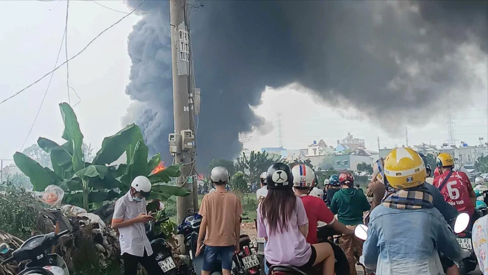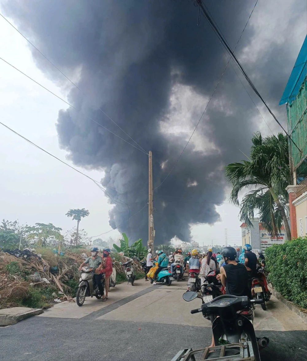 Do bên trong kho chứa nhiều vật liệu dễ cháy như nhựa, gỗ, giấy... nên ngọn lửa bùng phát mạnh, nhanh chóng bao trùm toàn bộ khu vực. Tại hiện trường, cột khói đen bốc cao hàng chục mét, có thể quan sát được từ khoảng cách rất xa.