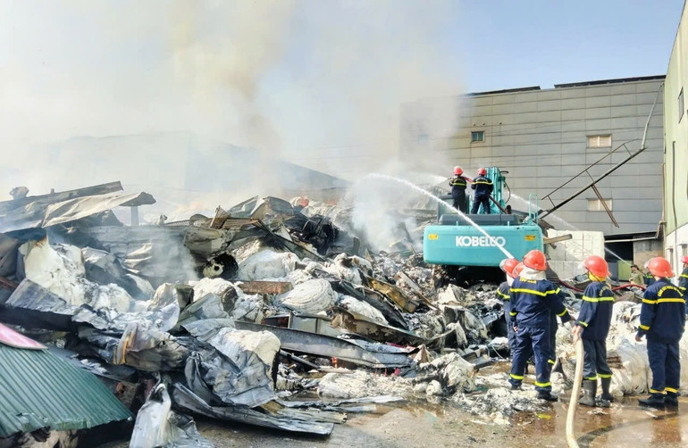 Đến 18 giờ 30 phút, lực lượng phòng cháy tiếp tục sử dụng xe múc và phun nước nhằm dập tắt đám cháy âm ỉ bên trong nhà xưởng bị sập.