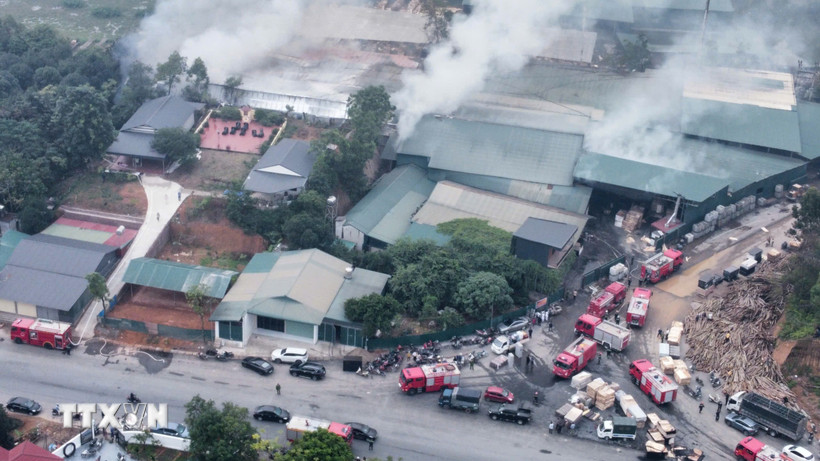Một vụ cháy lớn xảy ra tại xưởng sản xuất ván ép rộng hàng nghìn mét vuông, nằm sát đường tỉnh 325B thuộc Công ty TNHH Hải Hoài trên địa bàn xã Xuân Lũng (xã Tiên Kiên cũ), tỉnh Phú Thọ. (Ảnh: Hoàng Hùng/TTXVN)