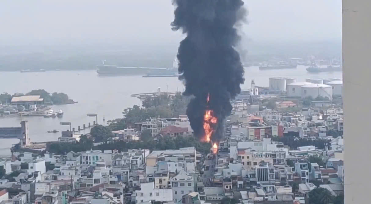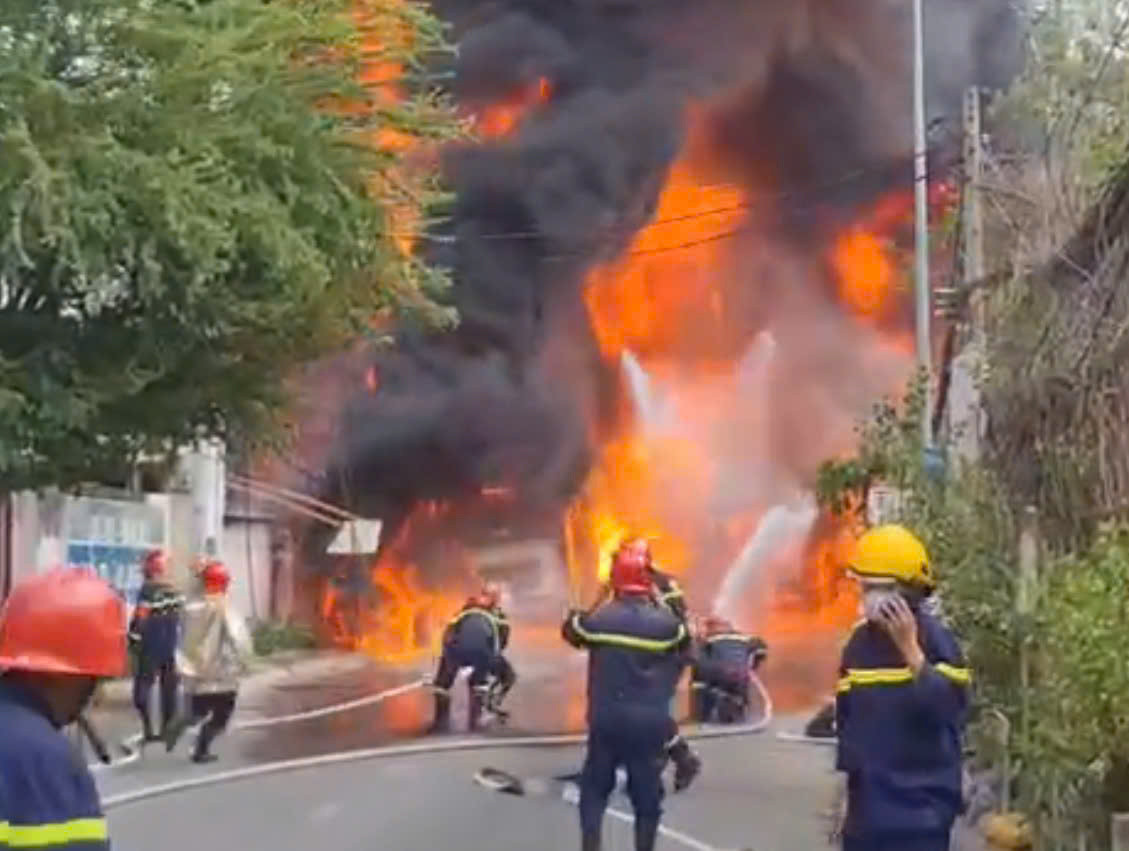 Ngọn lửa nhanh chóng bao trùm toàn bộ xe, tạo cột lửa và khói đen cao hàng chục mét, kèm nhiều tiếng nổ lớn. Đám cháy còn lan sang trụ điện ven đường, uy hiếp các nhà dân xung quanh, buộc nhiều người phải di dời tài sản đến khu vực an toàn.