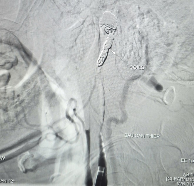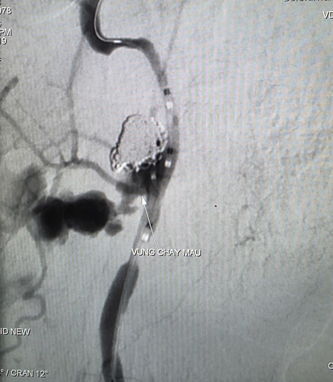 Kết quả chụp mạch ghi nhận ổ giả phình động mạch cảnh trong phải đoạn cổ, dưới nền sọ, kích thước khoảng 4,2 x 4,8 mm, cổ túi phình rộng và đang chảy máu. Ê kíp can thiệp đã sử dụng bóng để kiểm soát dòng chảy, sau đó đưa vi ống thông đến vị trí tổn thương và thả 9 vòng xoắn kim loại (coils) nhằm gây tắc hoàn toàn túi phình và đoạn động mạch cảnh trong phải, qua đó kiểm soát nguồn chảy máu.