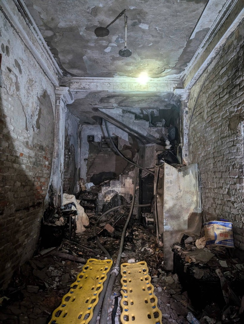 Tại hiện trường, 3 xe máy, toàn bộ nội thất tầng một bị cháy rụi. Tường, trần bong tróc hết lớp vữa. Cầu thang dẫn lên các tầng nằm trong cùng ngôi nhà bị cháy hết lan can.