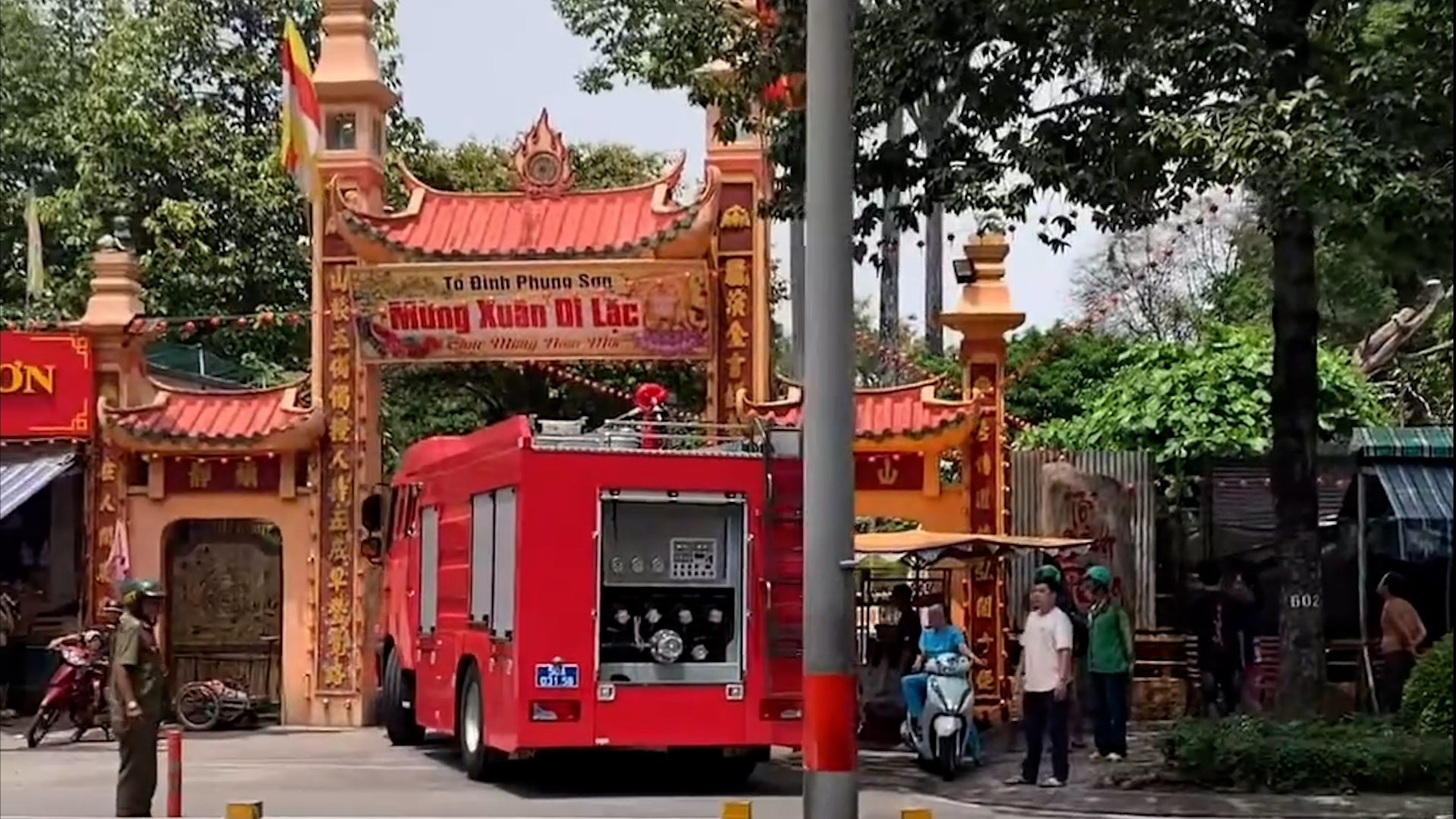 Do hẻm nhỏ, cảnh sát PCCC&CNCH điều khiển phương tiện vào một ngôi chùa gần đó để tiếp cận đám cháy. Ảnh: H. TÂM