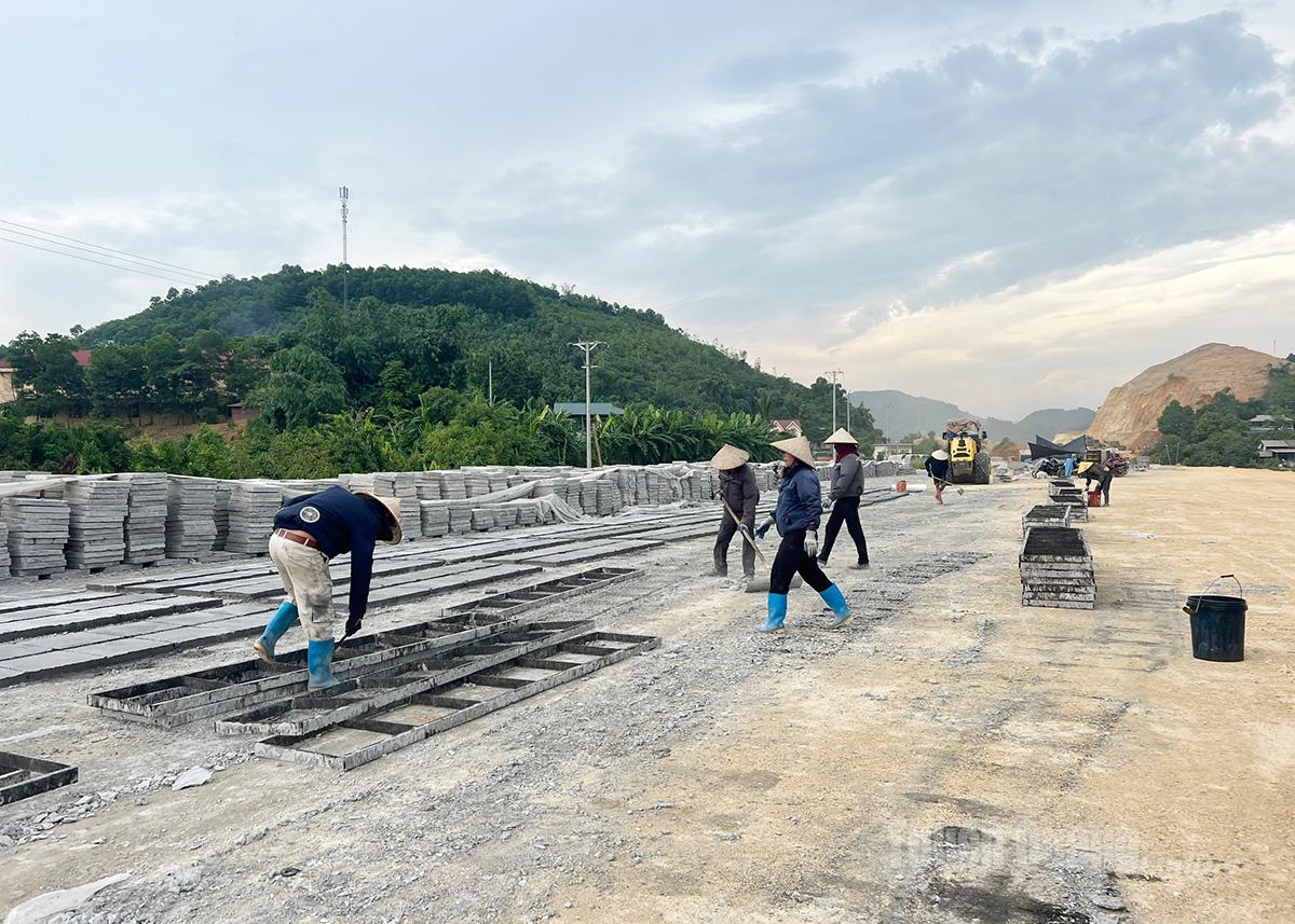 Công nhân lao động đang thực hiện đổ tấm đan.
