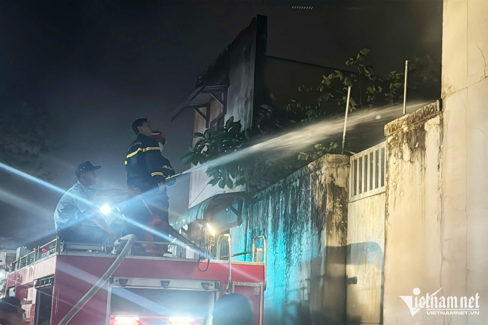 Cảnh sát phun nước khống chế đám cháy. Ảnh: Hoàng Anh