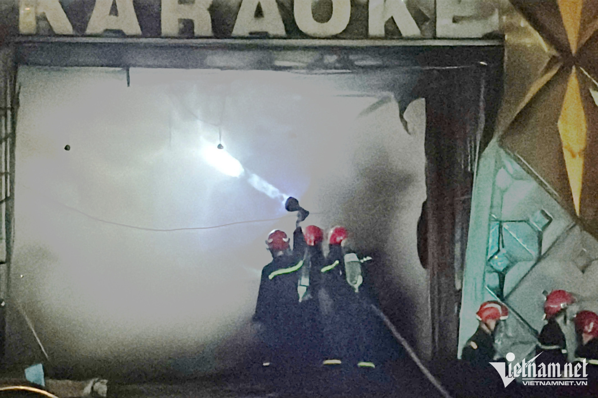 Cảnh sát đeo mặt nạ và bình dưỡng khí tiếp cận bên trong quán karaoke. Ảnh: Hoàng Anh