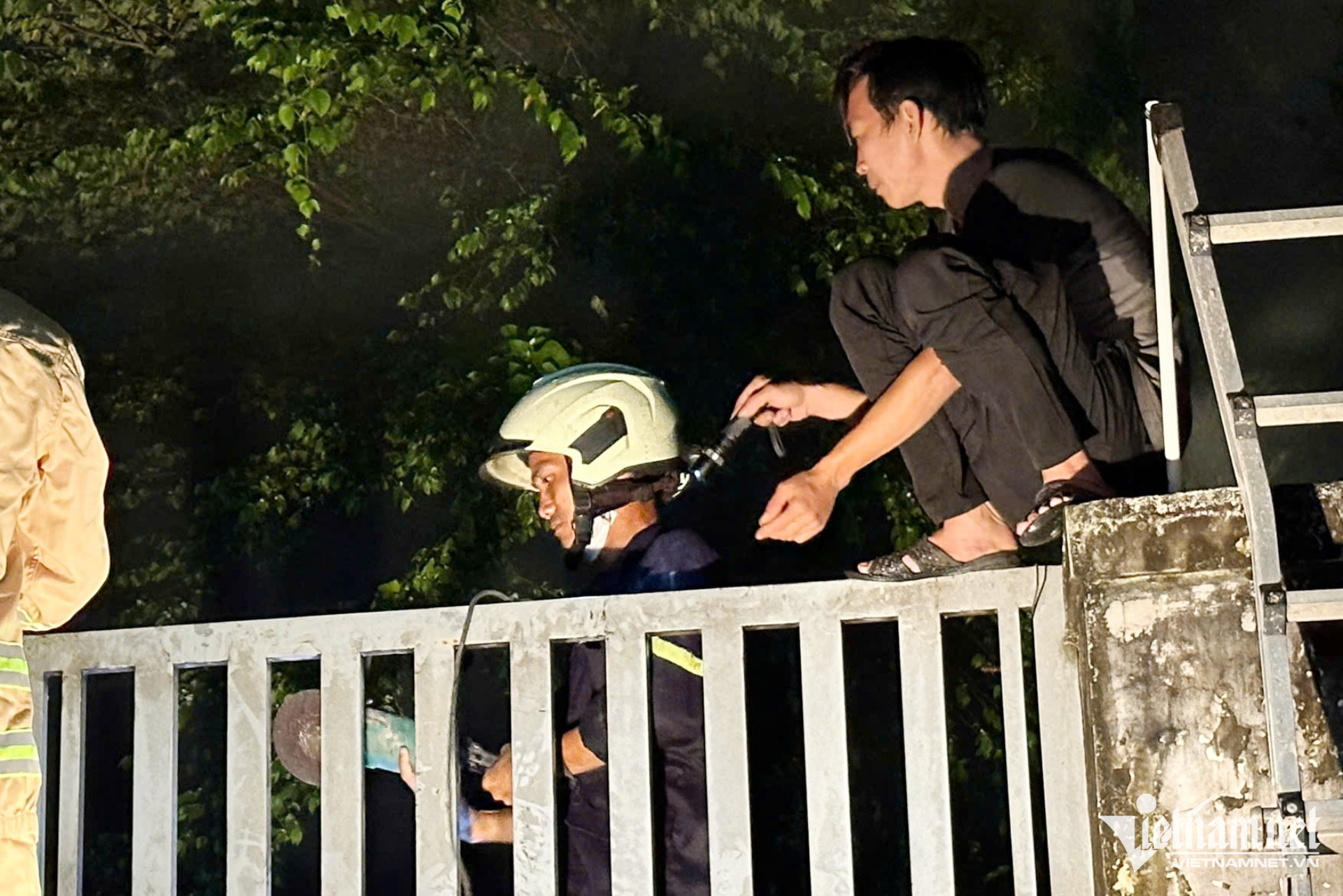 Lực lượng cảnh sát phải dùng máy cắt phá cửa tiếp cận từ phía sau. Ảnh: Hoàng Anh