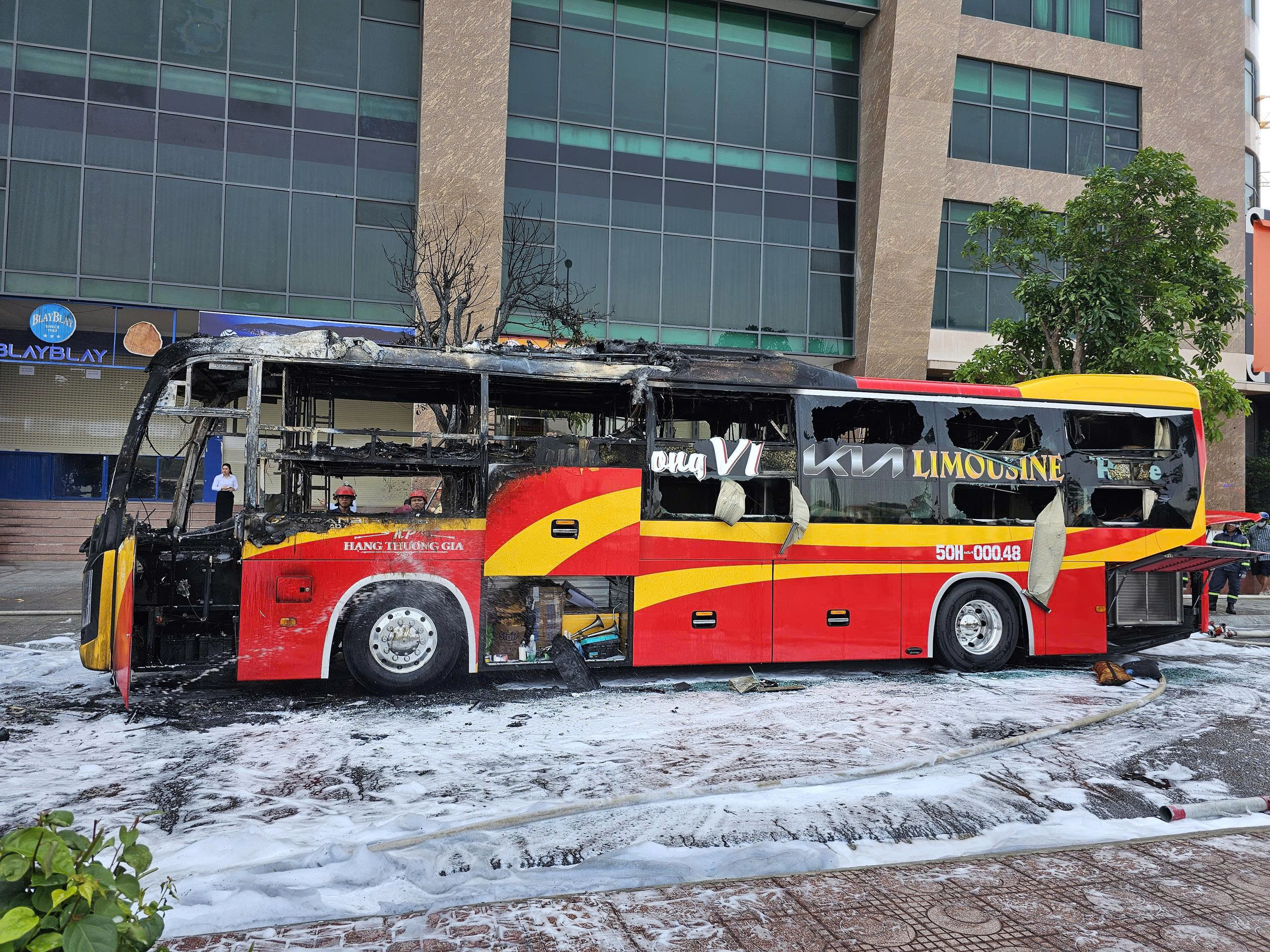 Xe khách bốc cháy dữ dội cạnh khách sạn 40 tầng.