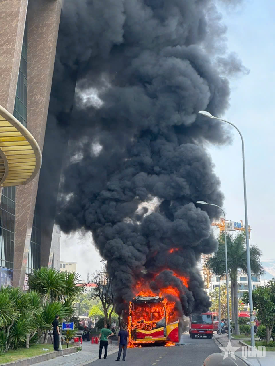 Cột khói đen cháy xe khách bao trùm tòa nhà.
