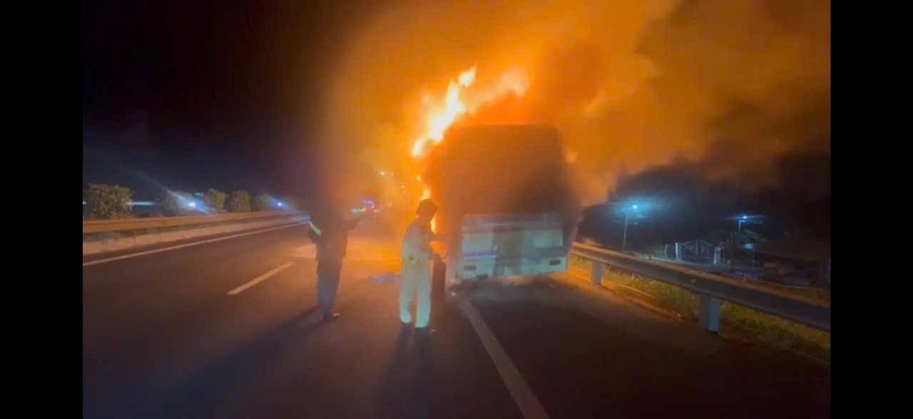 Ngay lập tức, tài xế cho xe chạy vào làn dừng khẩn cấp để kiểm tra thì phát hiện ngọn lửa bốc cháy tại hầm máy phía bên tài xế.