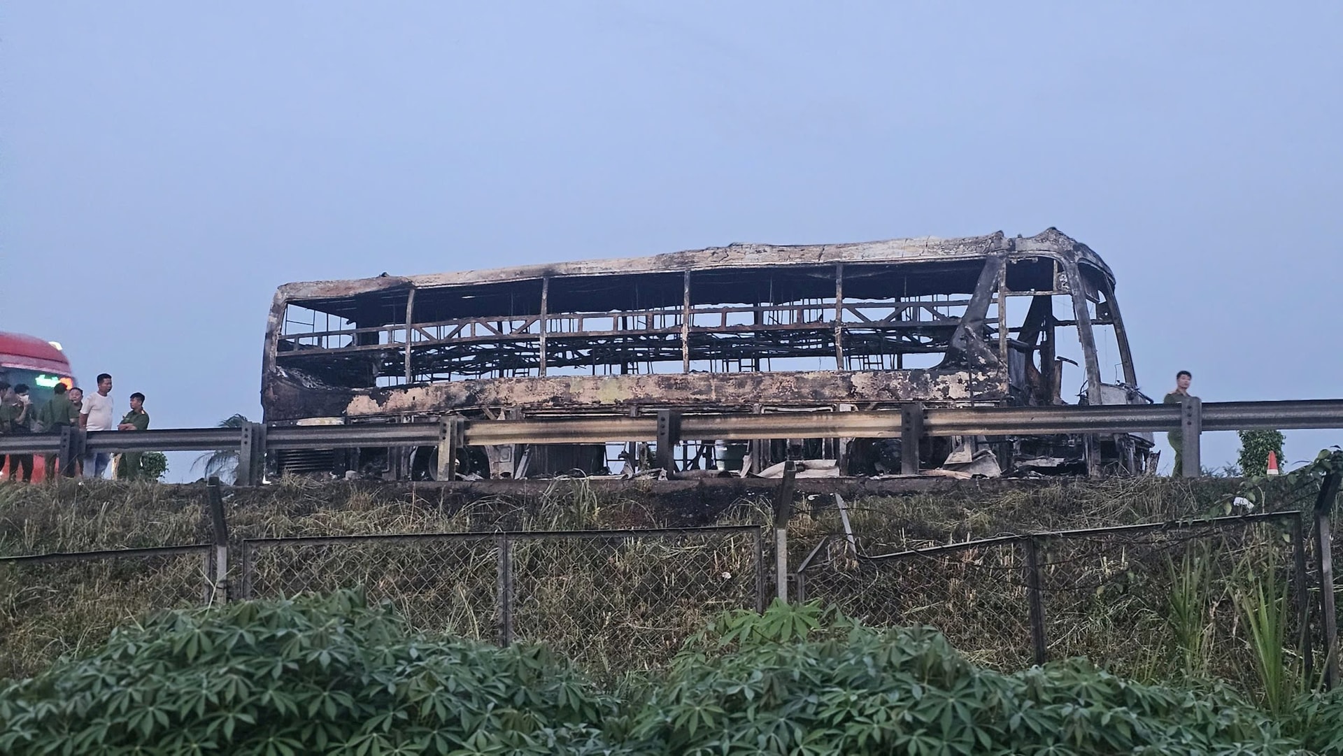 Tại hiện trường, chiếc xe bị cháy trơ khung, một số hành lý của khách bị thiệt hại.