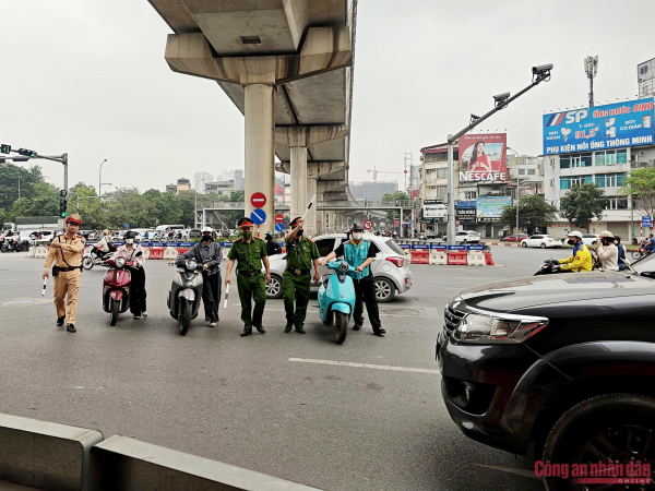 Tổ công tác của Đội CSGT số 6 phối hợp với Công an phường Từ Liêm xử lý tình trạng người điều khiển phương tiện đi ngược chiều tại khu vực nút giao Hồ Tùng Mậu - Phạm Hùng - Xuân Thủy.