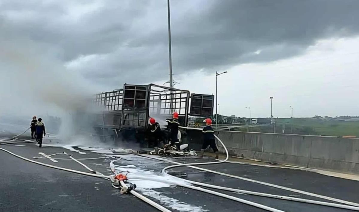 Cảnh sát PCCC và CNCH dập tắt vụ cháy xe tải trên cao tốc.