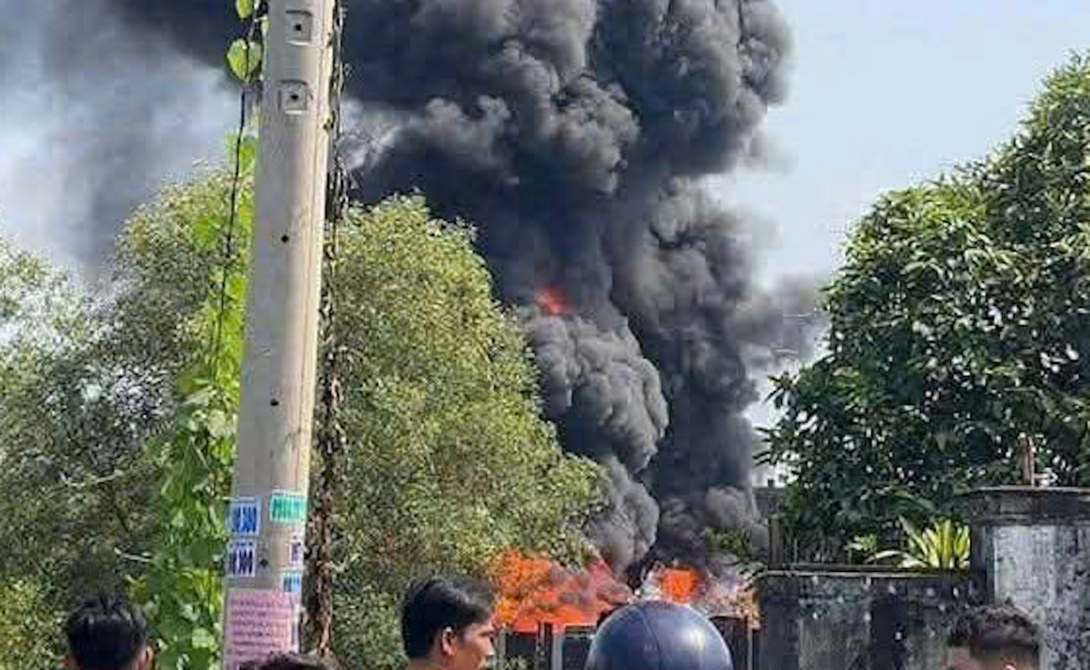 Do bên trong xưởng chứa nhiều vật liệu dễ cháy cùng lớp cỏ khô bao quanh, ngọn lửa nhanh chóng lan rộng, tạo cột khói đen bốc cao hàng chục mét, có thể nhìn thấy từ xa.