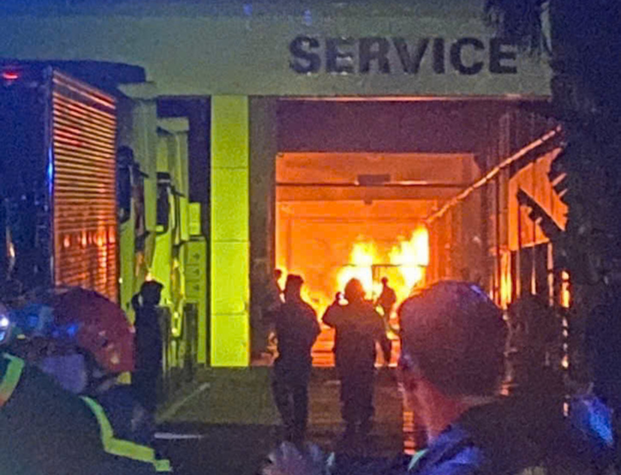 Chỉ trong vài phút, khói đen đặc quánh cuồn cuộn bốc lên cao, kèm cột lửa đỏ rực bao trùm khu vực kho xưởng.