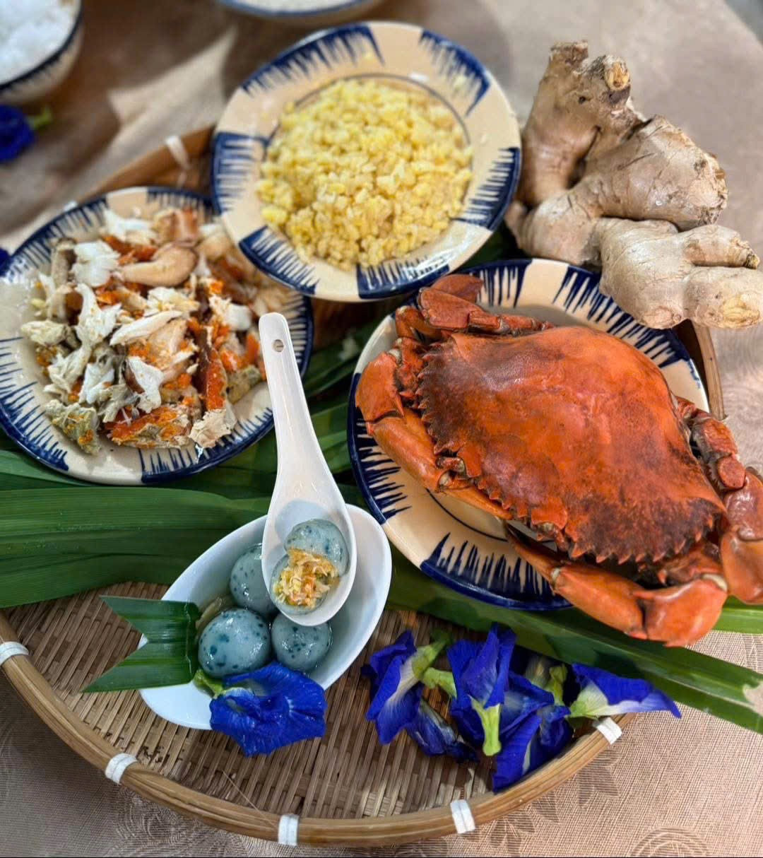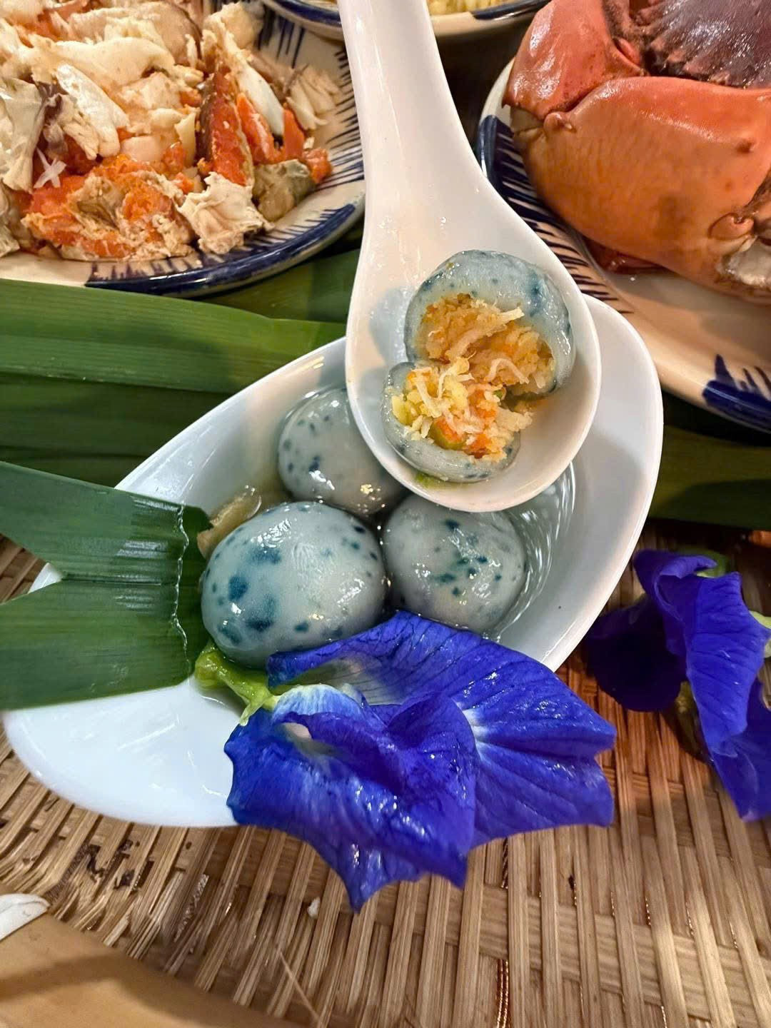 Thịt cua sau khi hấp chín được gỡ thủ công, sau đó xào cùng đậu xanh và hành tím để khử hoàn toàn mùi tanh, tạo độ bùi béo. Lớp vỏ bột năng bên ngoài được nhào nặn kỹ lưỡng, bọc lấy nhân rồi vo tròn. Để giao diện trong bắt mắt, hoa đậu biếc được dùng để tạo màu cho viên chè. Ngoài ra, nước dùng chè được nấu từ đường phèn, gừng tươi và lá dứa. Món ăn cần được làm nóng khi thưởng thức để không bị tanh và giữ được trọn vẹn hương vị.
