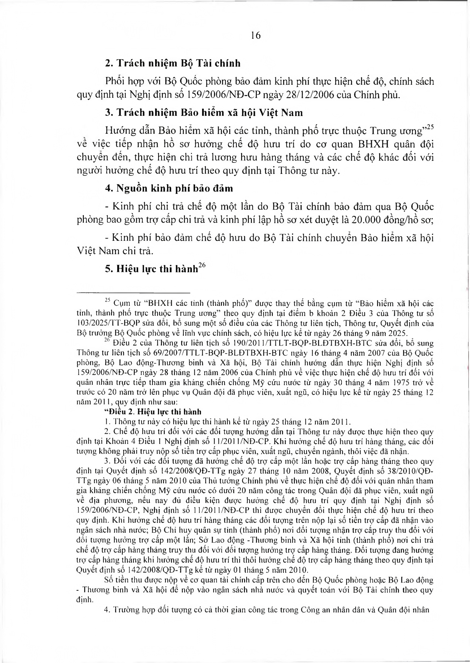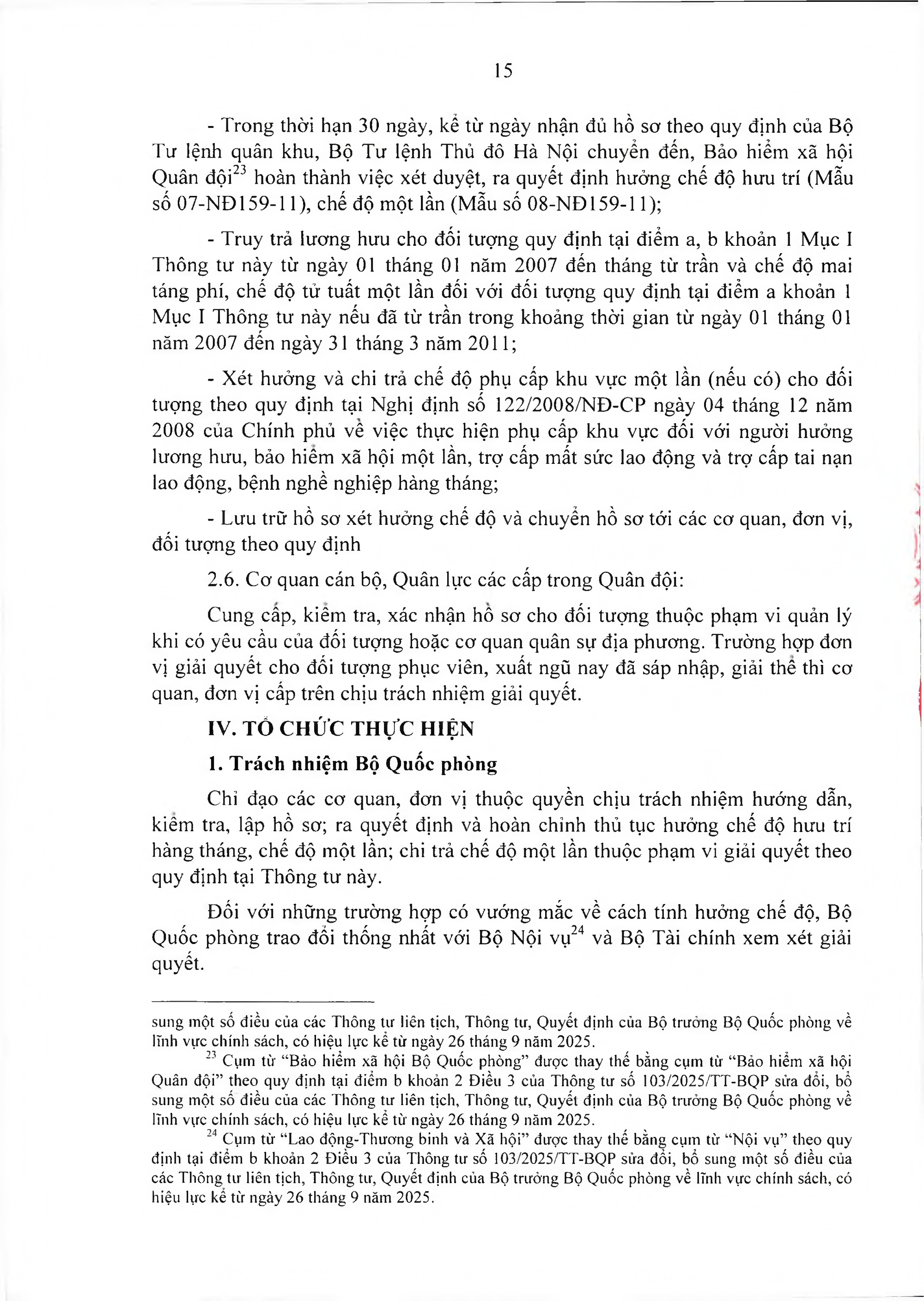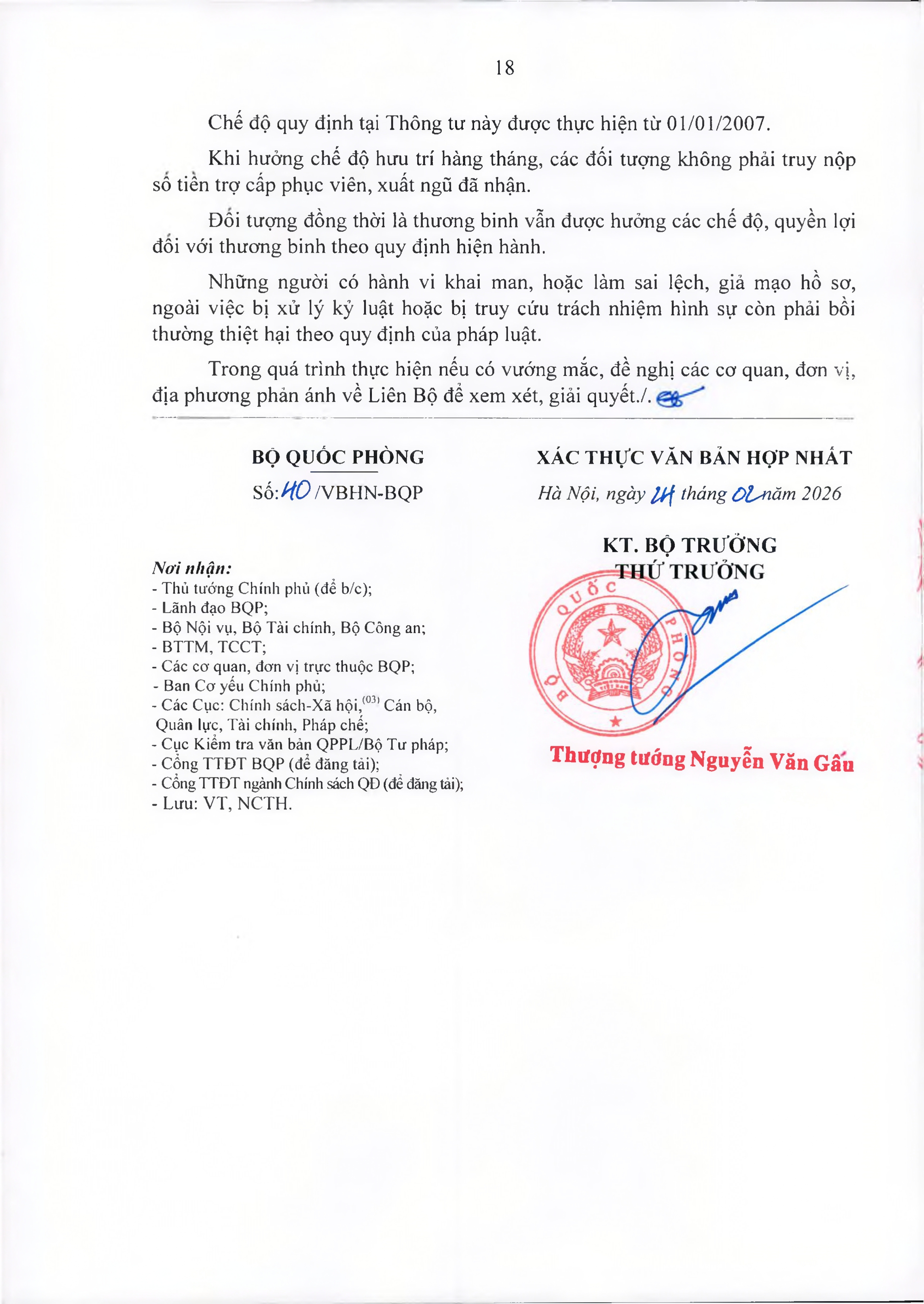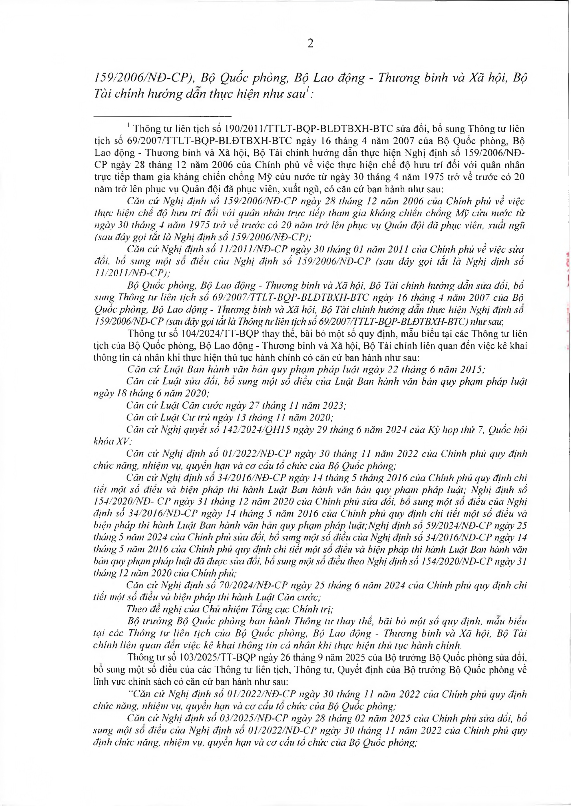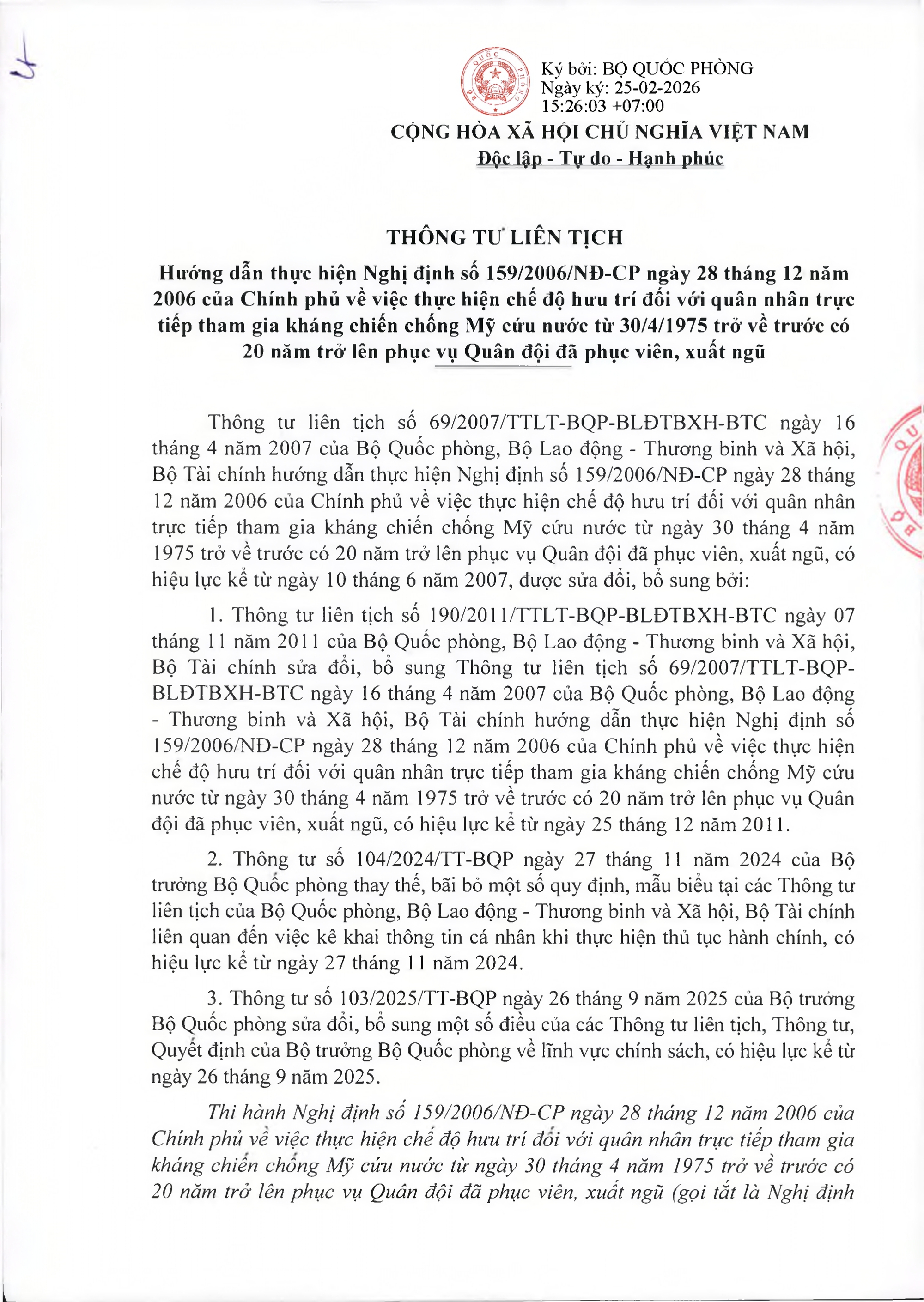 TOÀN VĂN: Văn bản hợp nhất số 40/VBHN-BQP Thông tư liên tịch hướng dẫn thực hiện Nghị định số 159/2006/NĐ-CP ngày 28/12/2006 của Chính phủ về việc thực hiện chế độ hưu trí đối với quân nhân trực tiếp tham gia kháng chiến chống Mỹ cứu nước từ 30/4/1975 trở về trước có 20 năm trở lên phục vụ Quân đội đã phục viên, xuất ngũ./.