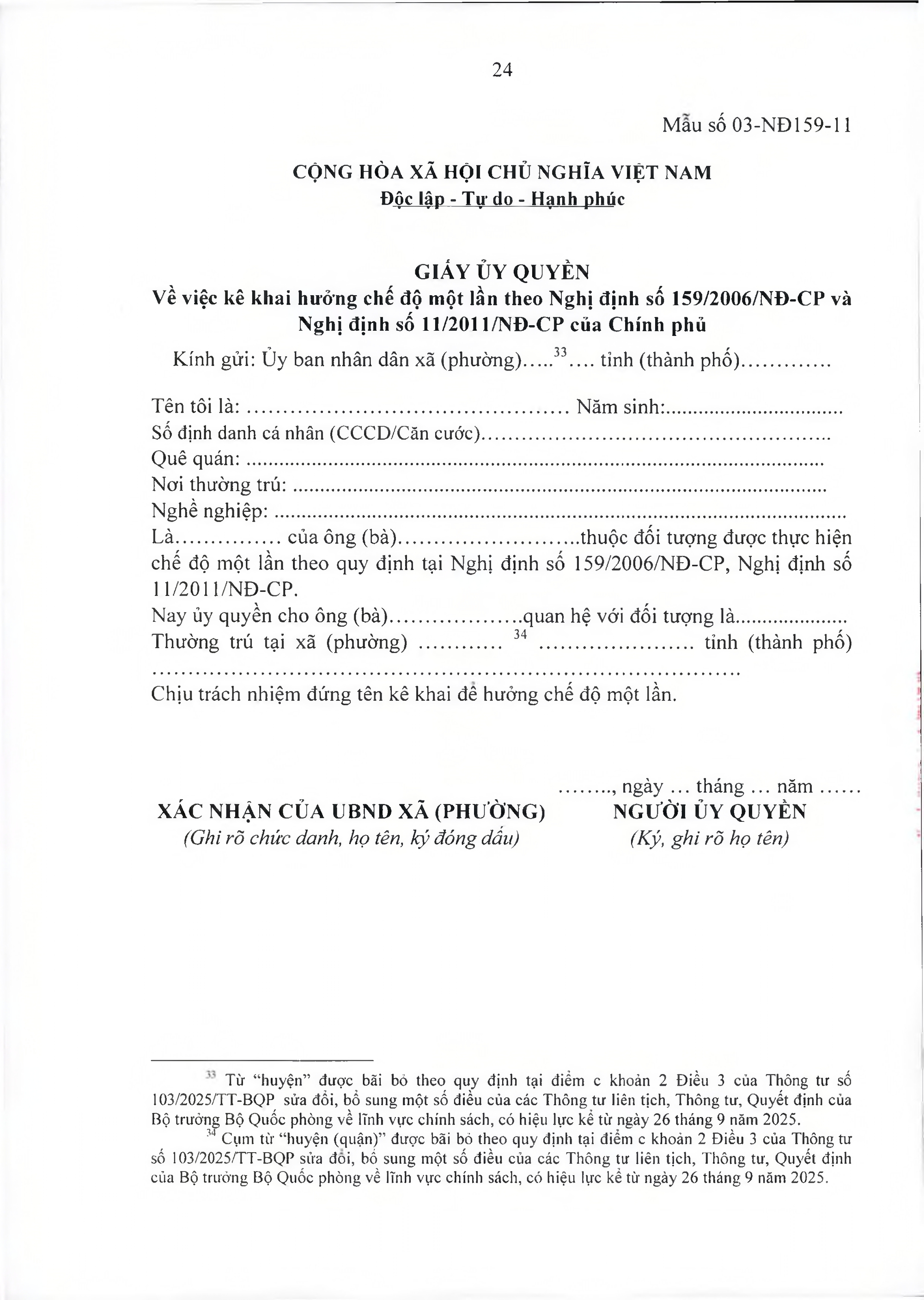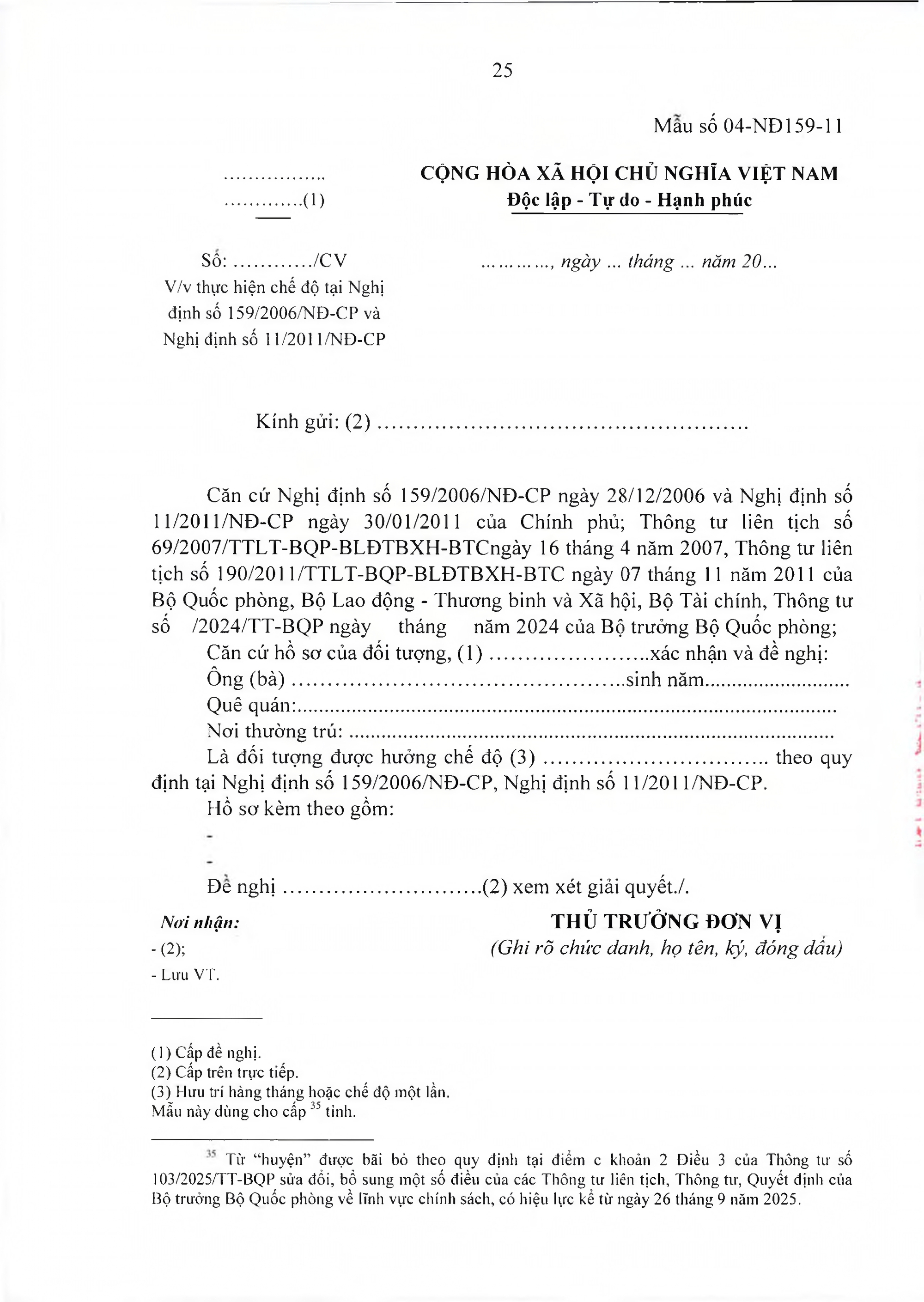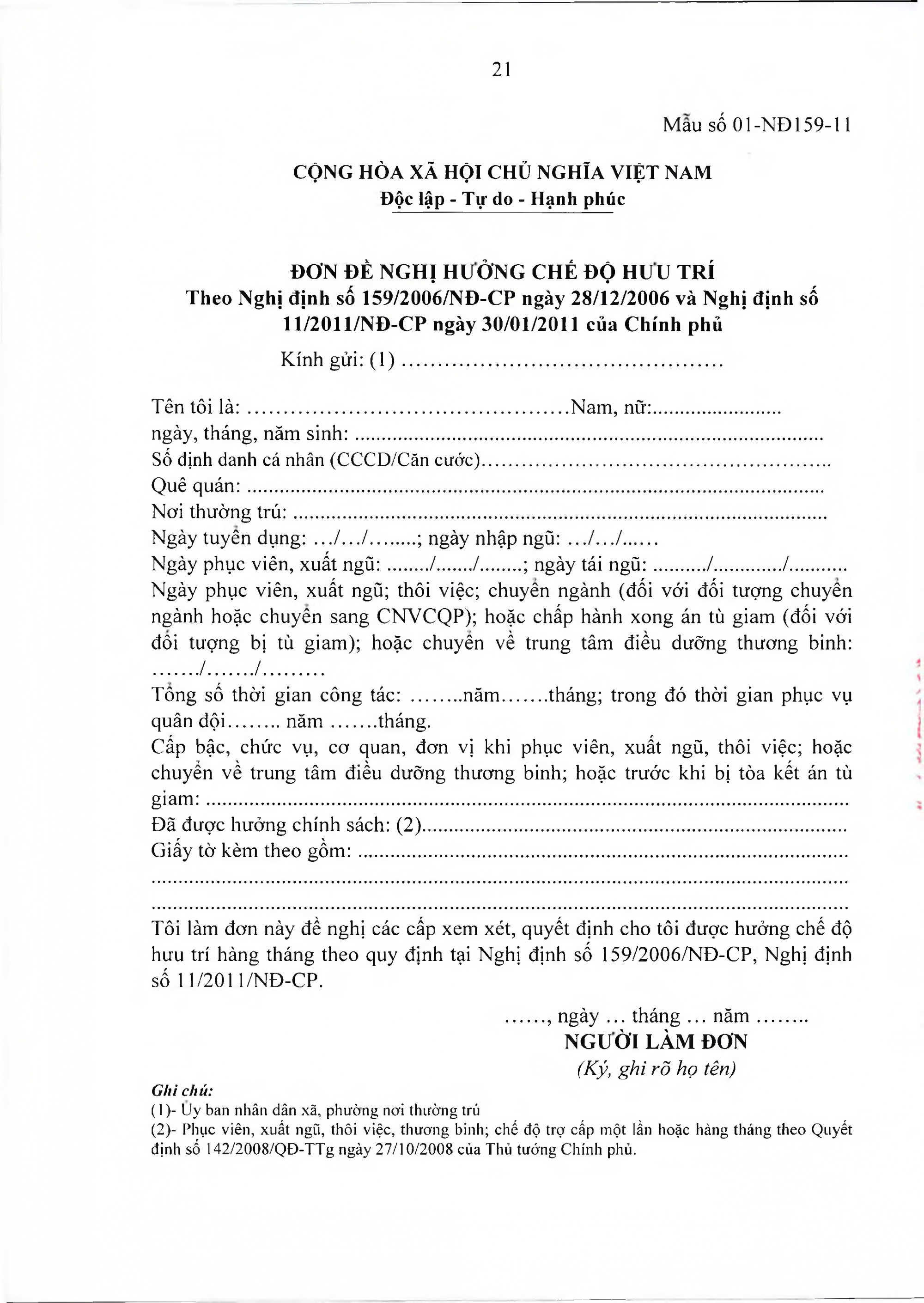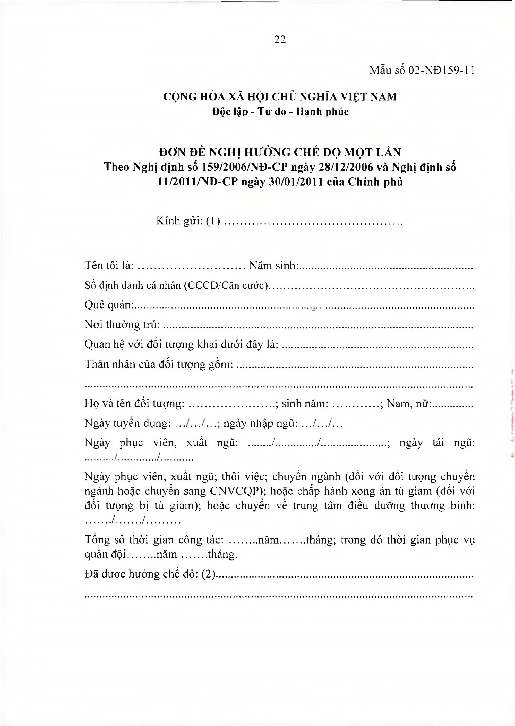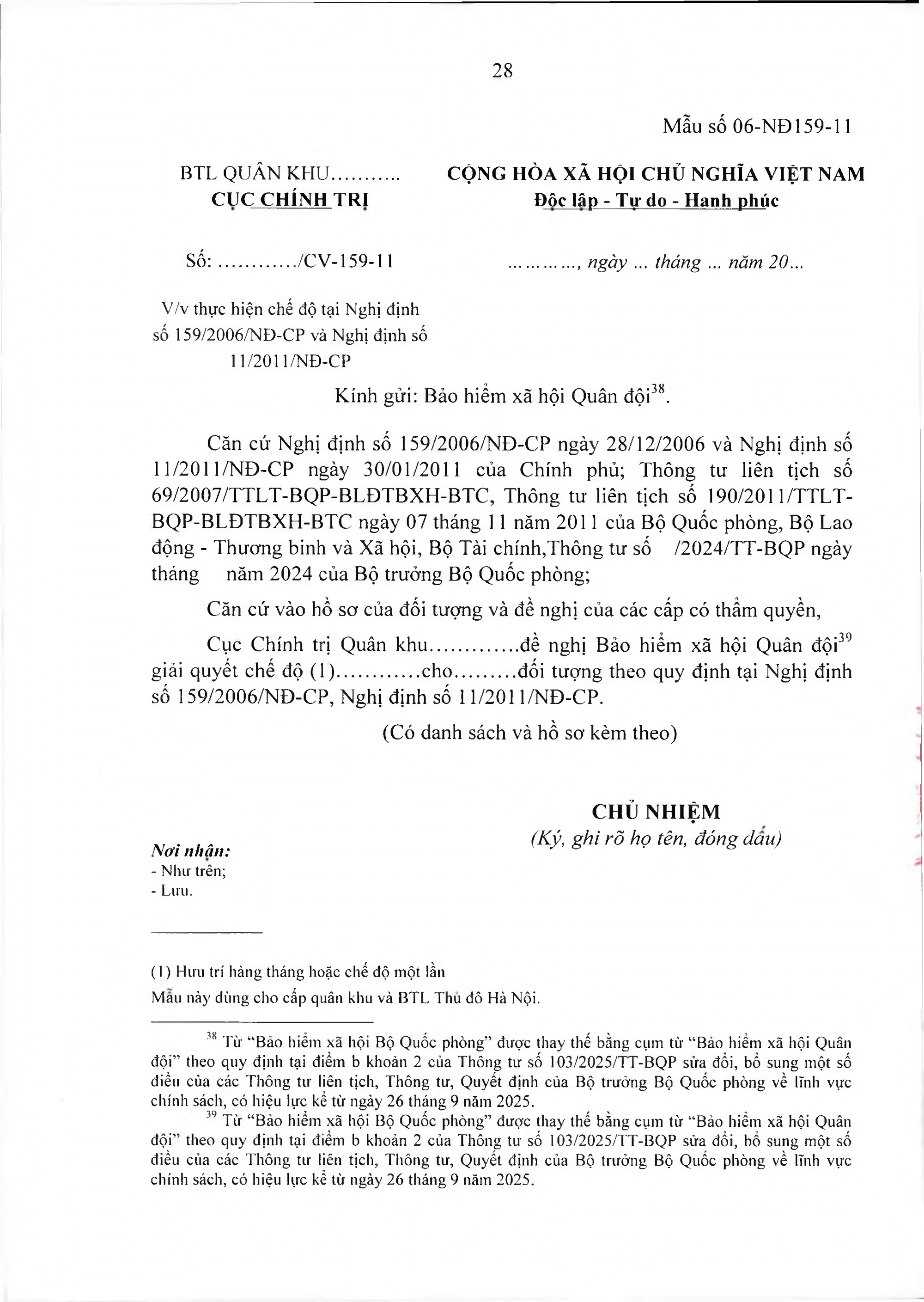 TOÀN VĂN: Văn bản hợp nhất số 40/VBHN-BQP Thông tư liên tịch hướng dẫn thực hiện Nghị định số 159/2006/NĐ-CP ngày 28/12/2006 của Chính phủ về việc thực hiện chế độ hưu trí đối với quân nhân trực tiếp tham gia kháng chiến chống Mỹ cứu nước từ 30/4/1975 trở về trước có 20 năm trở lên phục vụ Quân đội đã phục viên, xuất ngũ./.