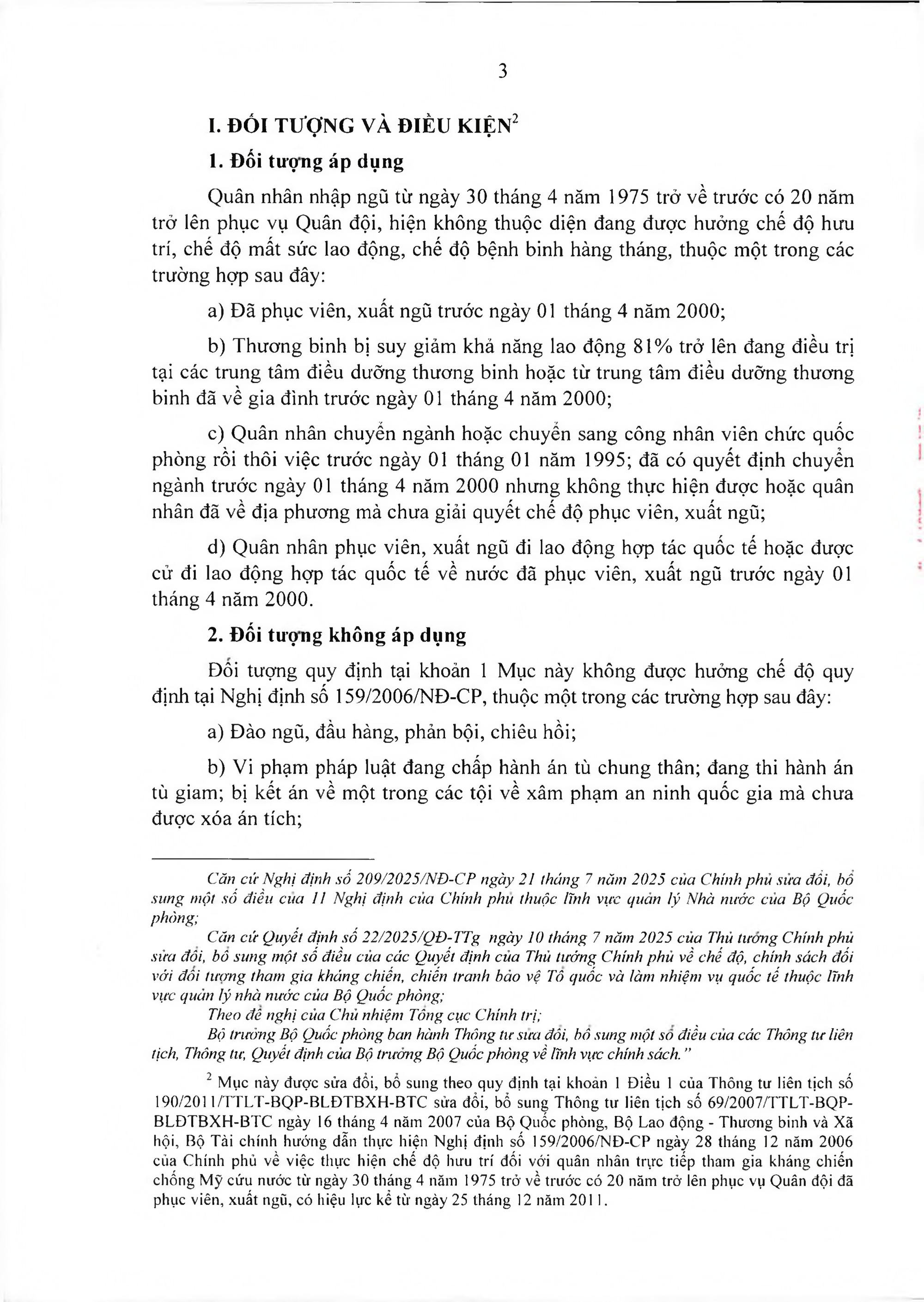 Quân nhân nhập ngũ từ ngày 30/4/1975 trở về trước có 20 năm trở lên phục vụ Quân đội, hiện không thuộc diện đang được hưởng chế độ hưu trí, chế độ mất sức lao động, chế độ bệnh binh hằng tháng, thuộc một trong các trường hợp sau đây: