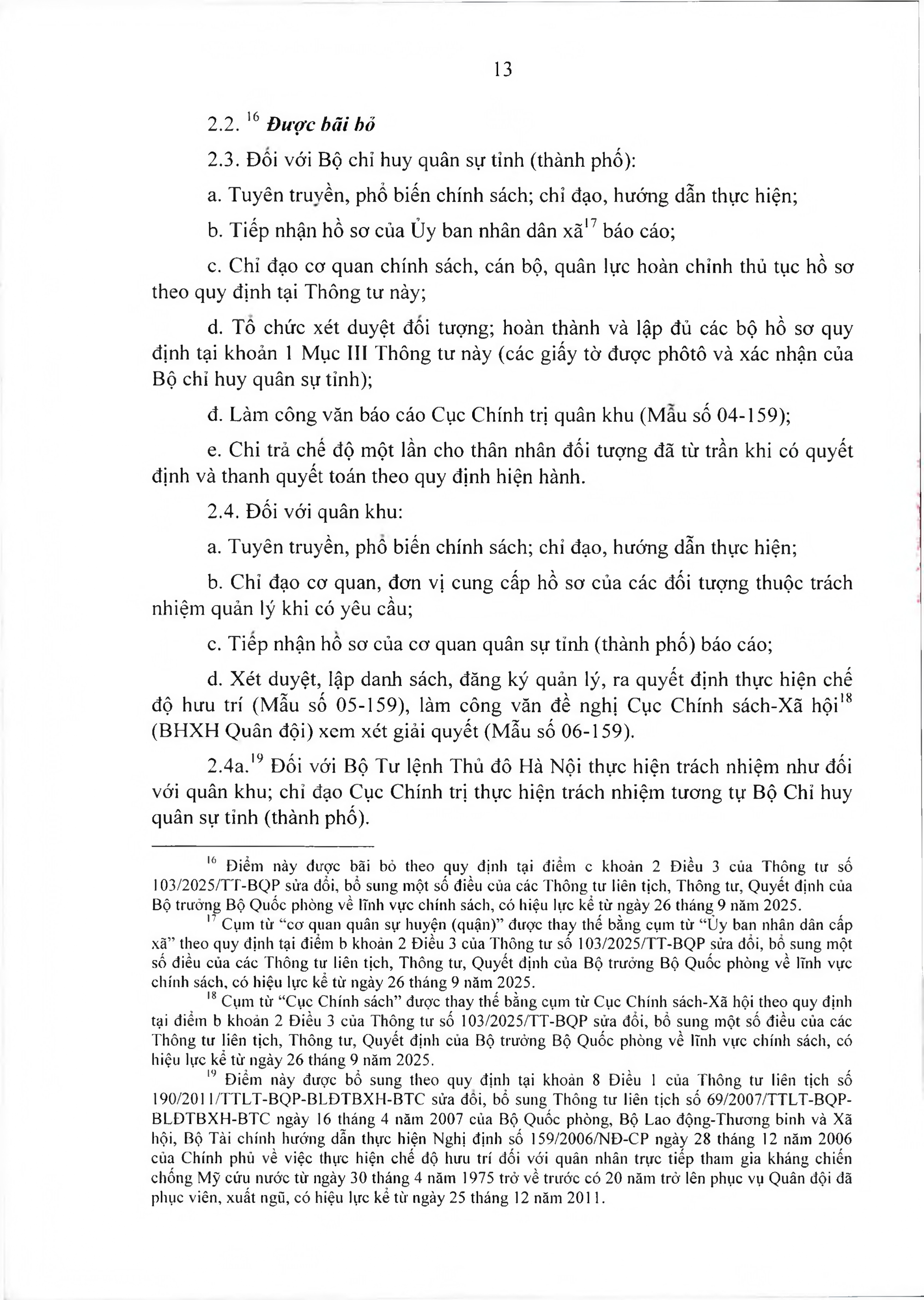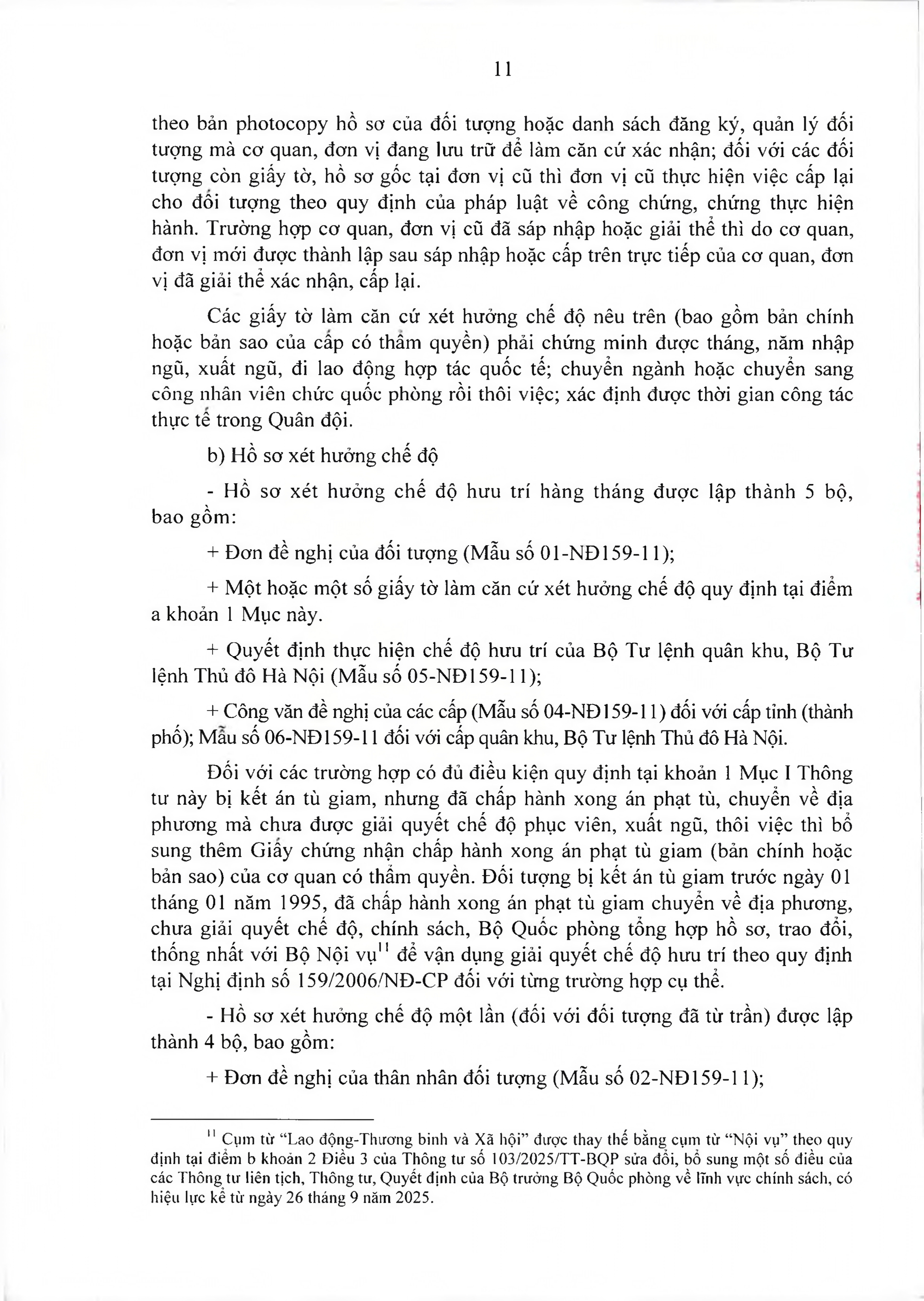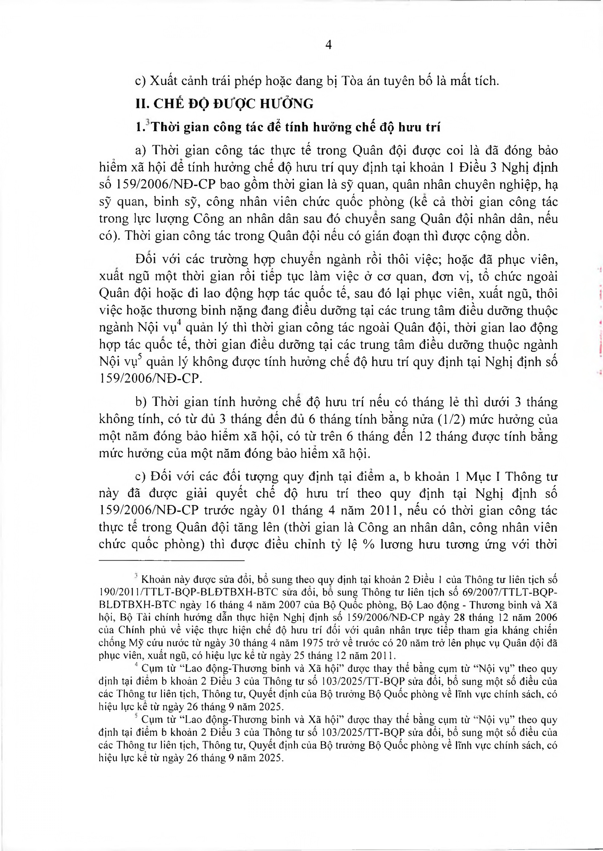 c) Đối với các đối tượng quy định tại điểm a, b khoản 1 Mục I Thông tư này đã được giải quyết chế độ hưu trí theo quy định tại Nghị định số 159/2006/NĐ-CP trước ngày 01 tháng 4 năm 2011, nếu có thời gian công tác thực tế trong Quân đội tăng lên (thời gian là Công an nhân dân, công nhân viên chức quốc phòng) thì được điều chỉnh tỷ lệ % lương hưu tương ứng với thời gian công tác thực tế theo quy định kể từ ngày 01 tháng 5 năm 2010.