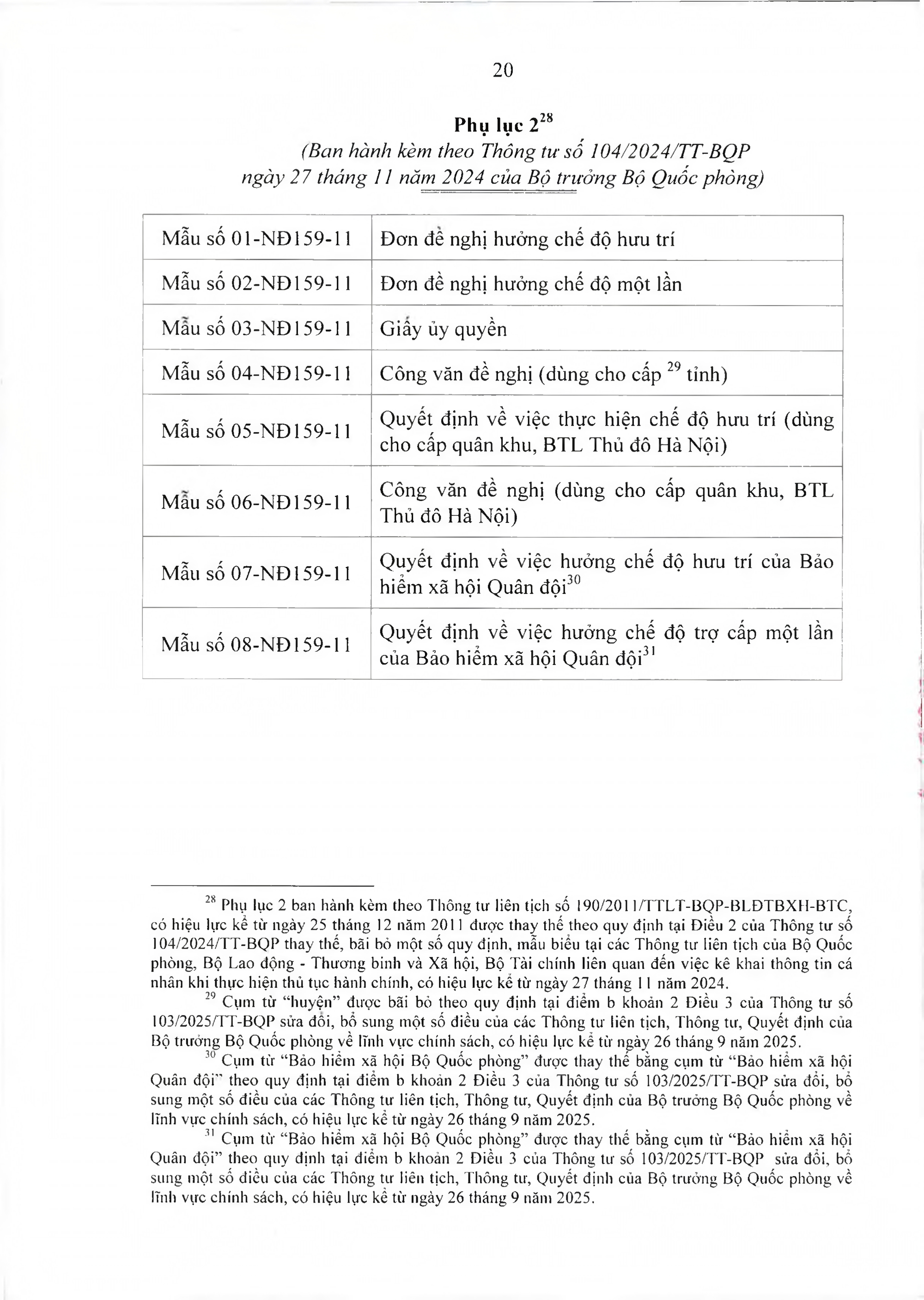 Bộ Quốc phòng vừa ban hành Văn bản hợp nhất số 40/VBHN-BQP Thông tư liên tịch hướng dẫn thực hiện Nghị định số 159/2006/NĐ-CP ngày 28/12/2006 của Chính phủ về việc thực hiện chế độ hưu trí đối với quân nhân trực tiếp tham gia kháng chiến chống Mỹ cứu nước từ 30/4/1975 trở về trước có 20 năm trở lên phục vụ Quân đội đã phục viên, xuất ngũ.