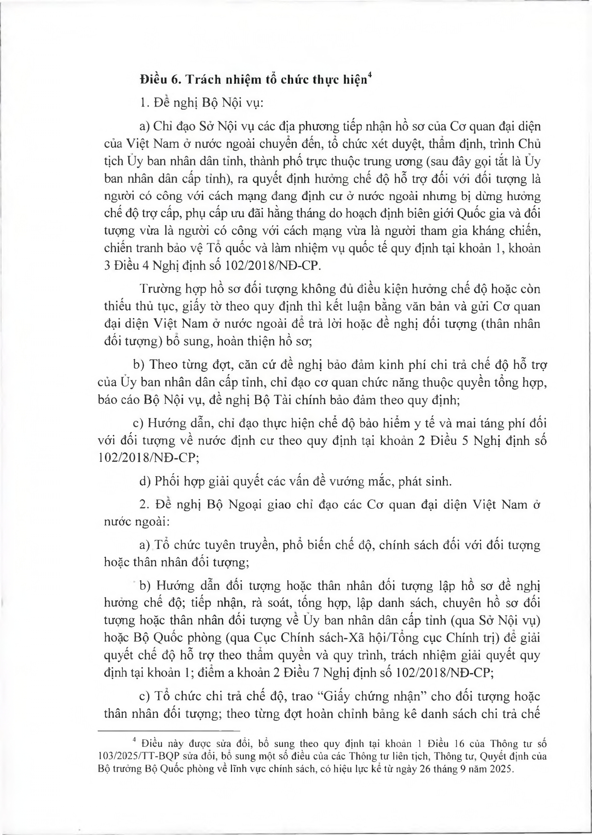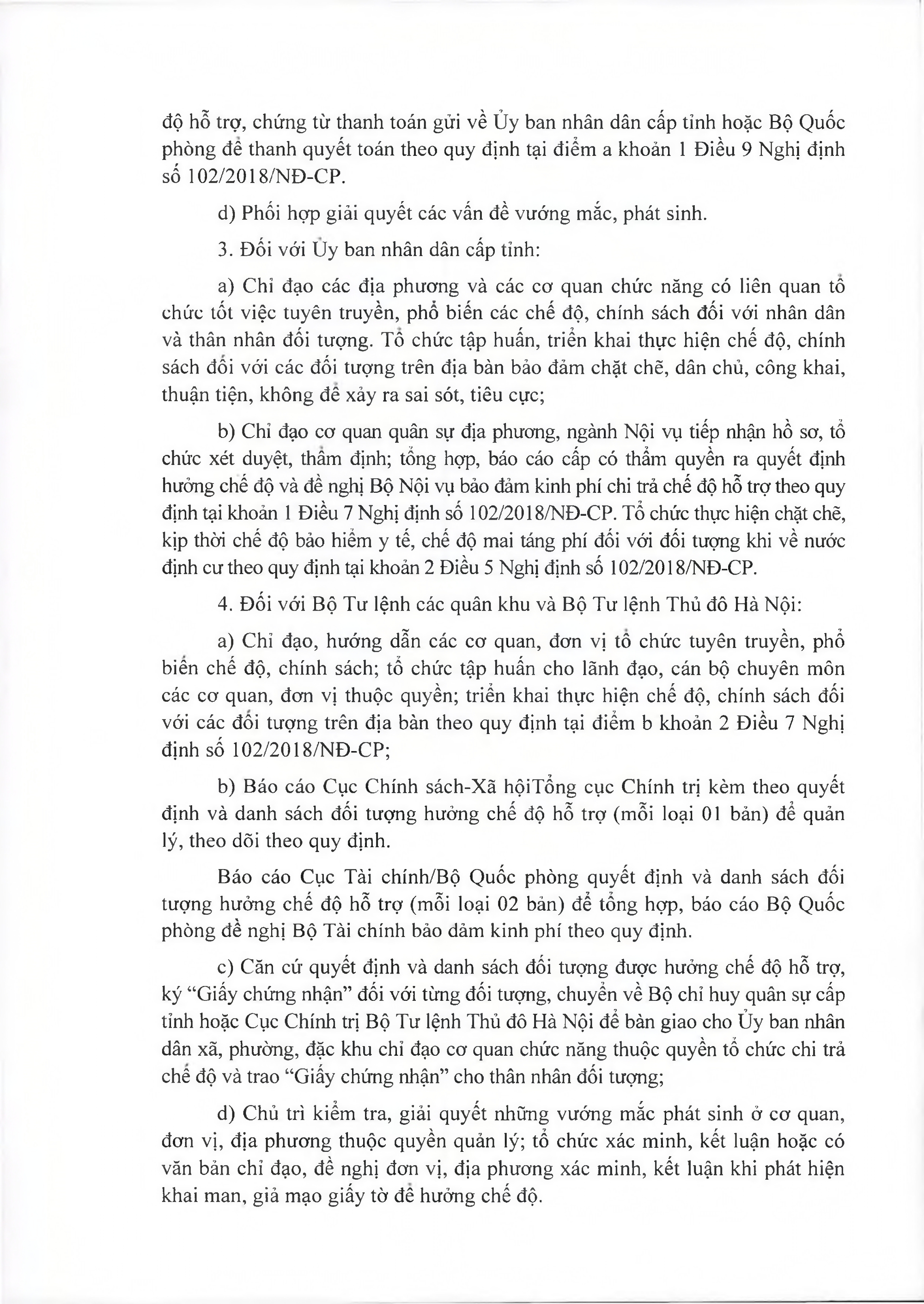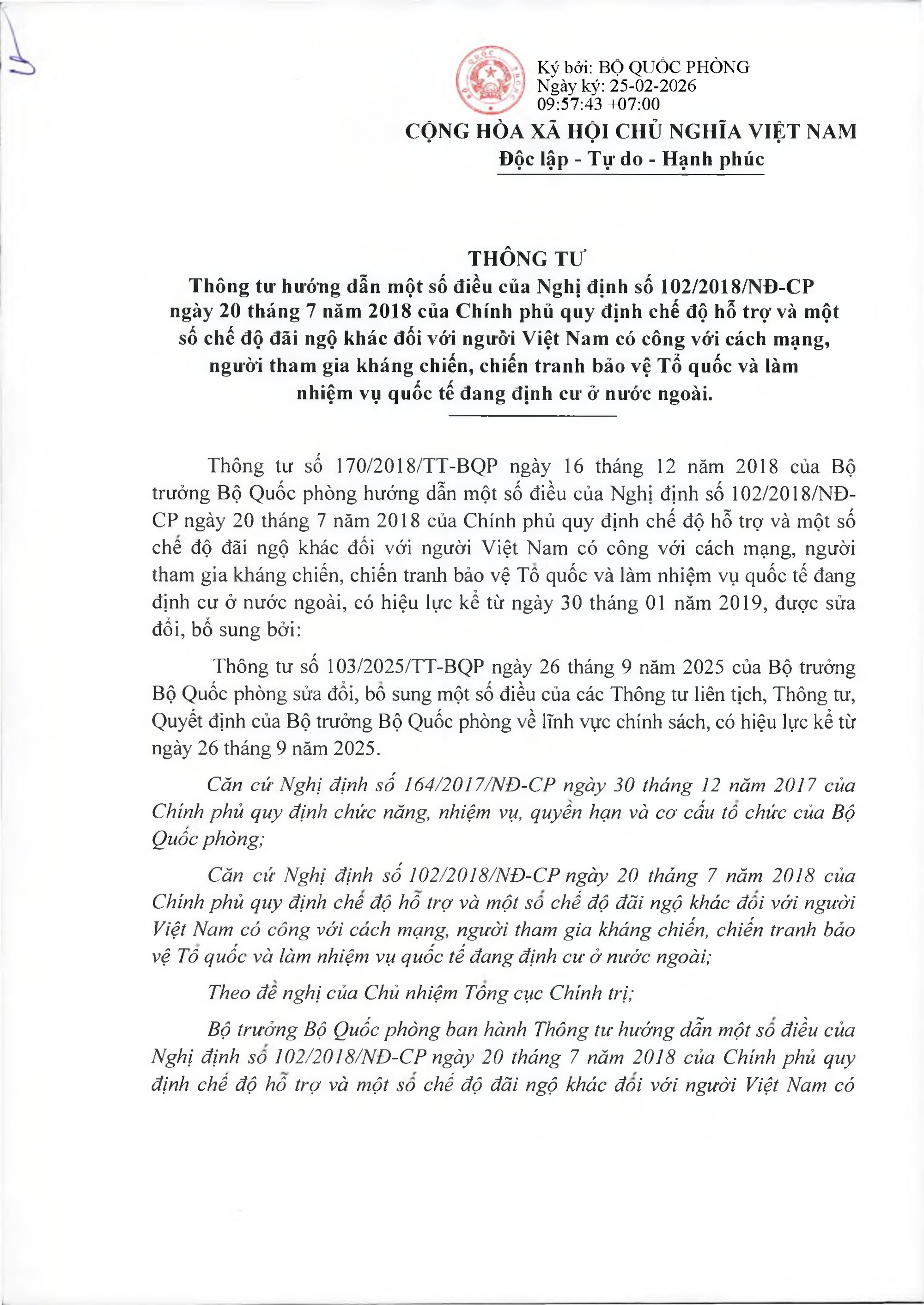 TOÀN VĂN: Văn bản hợp nhất số 29/VBHN-BQP Thông tư hướng dẫn một số điều của Nghị định số 102/2018/NĐ-CP ngày 20/7/2018 của Chính phủ quy định chế độ hỗ trợ và một số chế độ đãi ngộ khác đối với người Việt Nam có công với cách mạng, người tham gia kháng chiến, chiến tranh bảo vệ Tổ quốc và làm nhiệm vụ quốc tế đang định cư ở nước ngoài./.