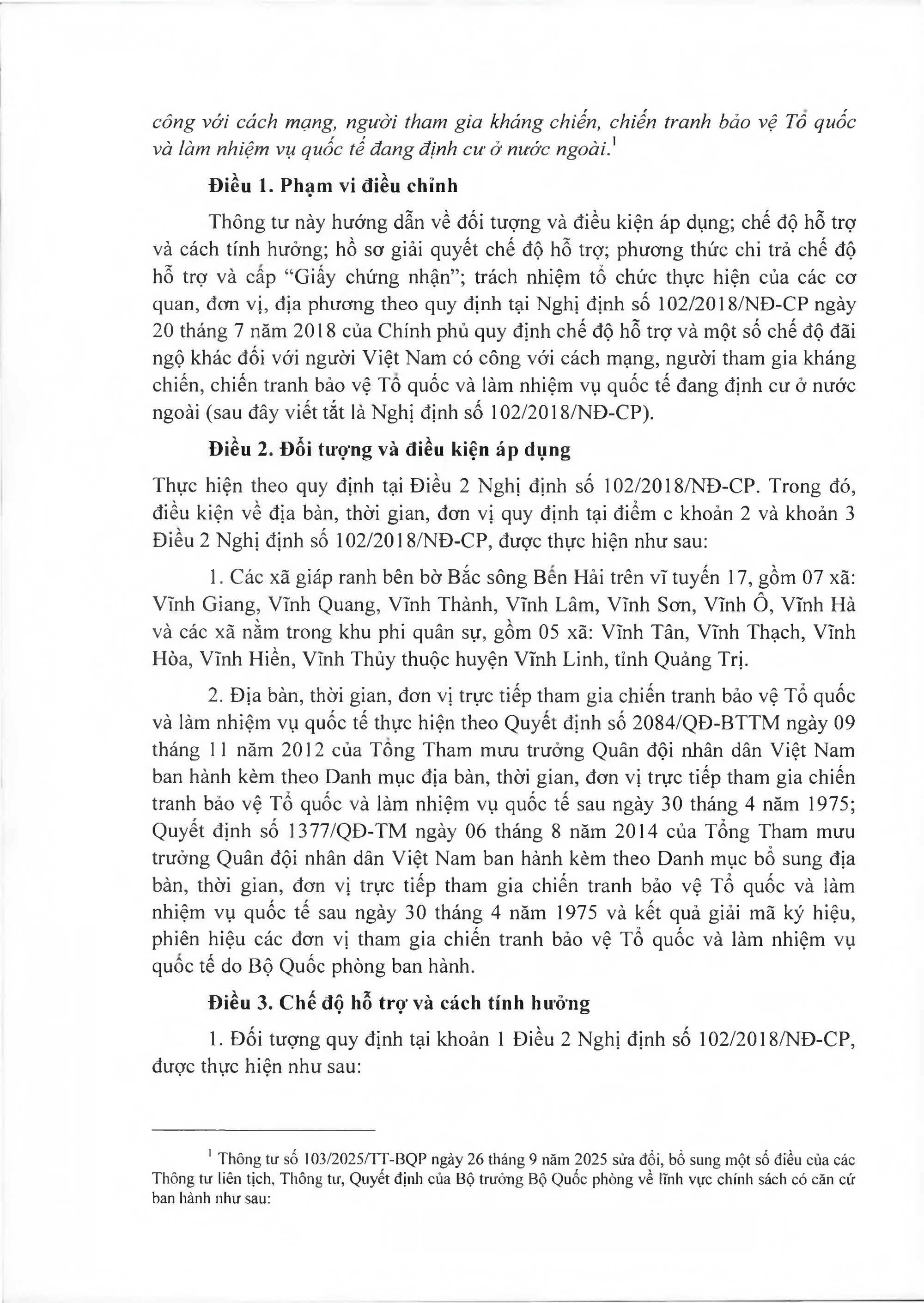 2. Địa bàn, thời gian, đơn vị trực tiếp tham gia chiến tranh bảo vệ Tổ quốc và làm nhiệm vụ quốc tế thực hiện theo Quyết định số 2084/QĐ-BTTM ngày 09/11/2012 của Tổng Tham mưu trưởng Quân đội nhân dân Việt Nam ban hành kèm theo Danh mục địa bàn, thời gian, đơn vị trực tiếp tham gia chiến tranh bảo vệ Tổ quốc và làm nhiệm vụ quốc tế sau ngày 30/4/1975; Quyết định số 1377/QĐ-TM ngày 06/8/2014 của Tổng Tham mưu trưởng Quân đội nhân dân Việt Nam ban hành kèm theo Danh mục bổ sung địa bàn, thời gian, đơn vị trực tiếp tham gia chiến tranh bảo vệ Tổ quốc và làm nhiệm vụ quốc tế sau ngày 30/4/1975 và kết quả giải mã ký hiệu, phiên hiệu các đơn vị tham gia chiến tranh bảo vệ Tổ quốc và làm nhiệm vụ quốc tế do Bộ Quốc phòng ban hành.