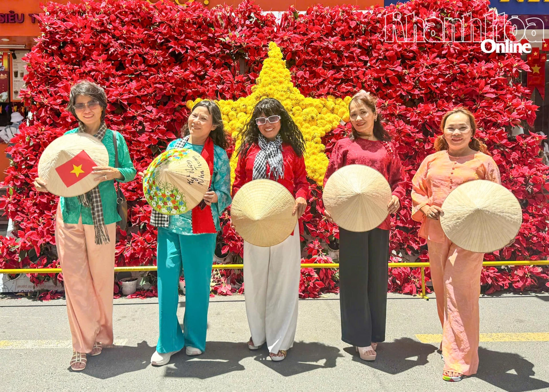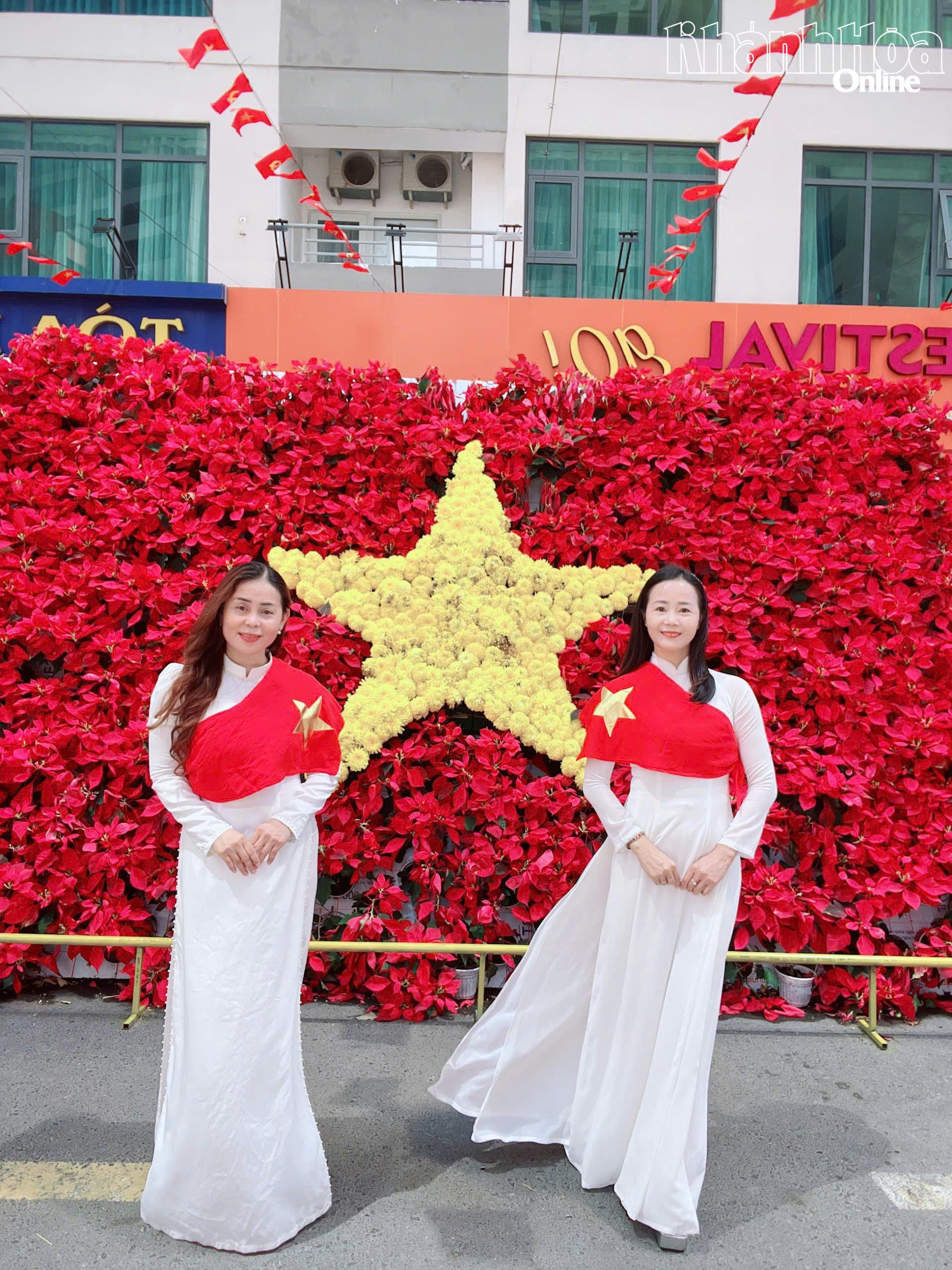 Những ngày này, khu vực dưới chân tòa nhà Mường Thanh Viễn Triều (phường Bắc Nha Trang) trở thành điểm đến thu hút đông đảo người dân và du khách đến chụp ảnh chào mừng kỷ niệm 51 năm Ngày Giải phóng miền Nam, thống nhất đất nước (30-4-1975 - 30-4-2026). Nổi bật nhất tại điểm check-in là hình ảnh lá cờ đỏ sao vàng được kết từ các loại hoa. Trên nền đỏ rực rỡ của hoa trạng nguyên, ngôi sao vàng năm cánh được kết từ những bông cúc vàng nổi bật.