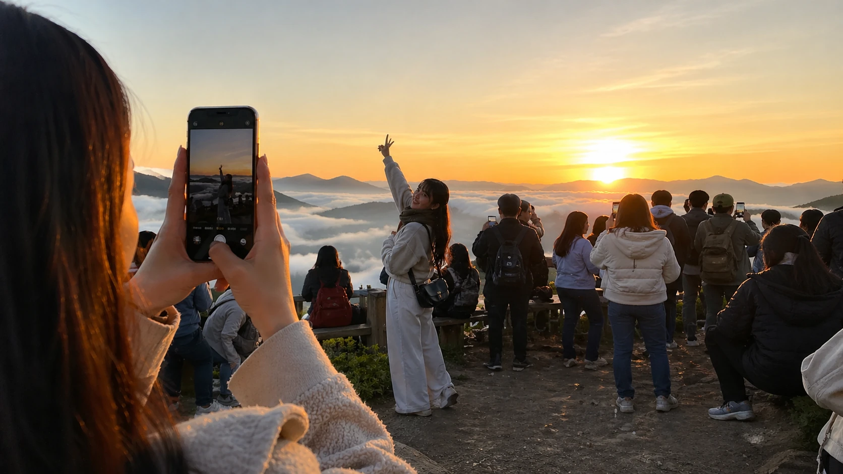 Ở một phố cổ đông khách, người ta xếp hàng để chụp cùng một bức tường quen . Trên một đỉnh núi, từng nhóm thay nhau vài phút để có một tấm ảnh “đúng góc”. Trong quán cà phê, có người dành phần lớn thời gian để chỉnh lại ánh sáng, sắp xếp, bày biện, chỉ để có một khung hình vừa ý.