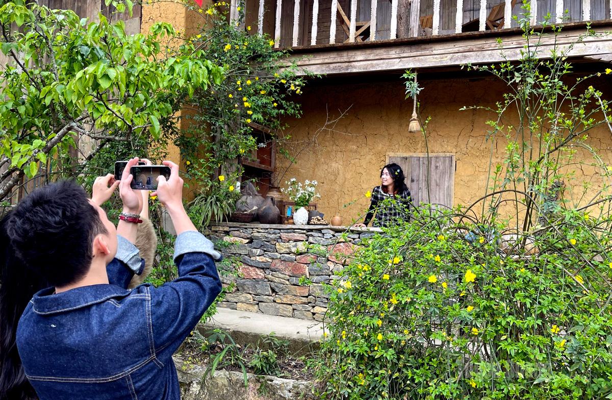 Du khách lưu lại khoảnh khắc dưới tán hoa đào trước cổng của ngôi nhà tường đất truyền thống ở làng Lô Lô Chải.