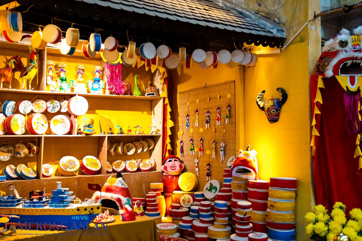 Gian đồ chơi xưa do nghệ nhân Thanh Oai phục dựng gợi nhớ hình ảnh đèn kéo quân, đèn ông sư, tò he và ông đánh gậy trông trăng – những món đồ chơi từng gắn bó với tuổi thơ của nhiều thế hệ. Ảnh Mekongasean