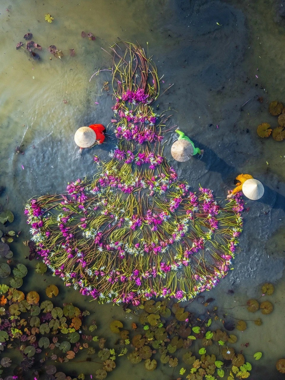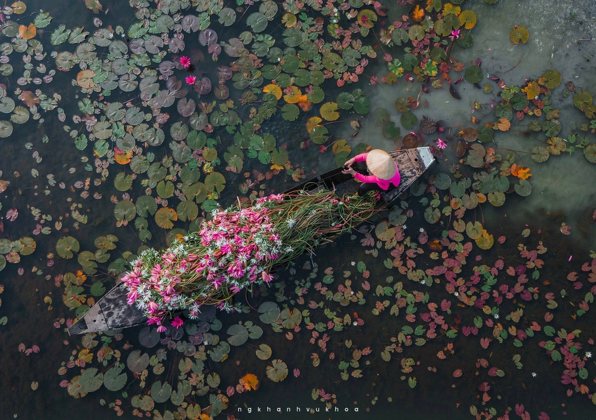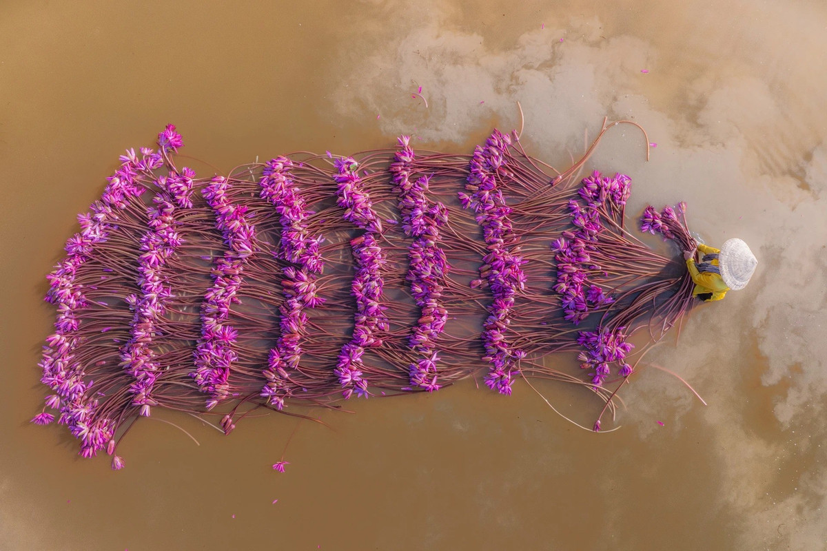 Nhìn từ trên cao, những thảm hoa trải dài như tấm lụa mềm phủ kín ao hồ, xen giữa là bóng dáng con người thoáng ẩn hiện trong làn sương sớm, khiến khung cảnh trở nên thơ mộng như một bức tranh thủy mặc. Ảnh Nguyễn Khánh Vũ Khoa