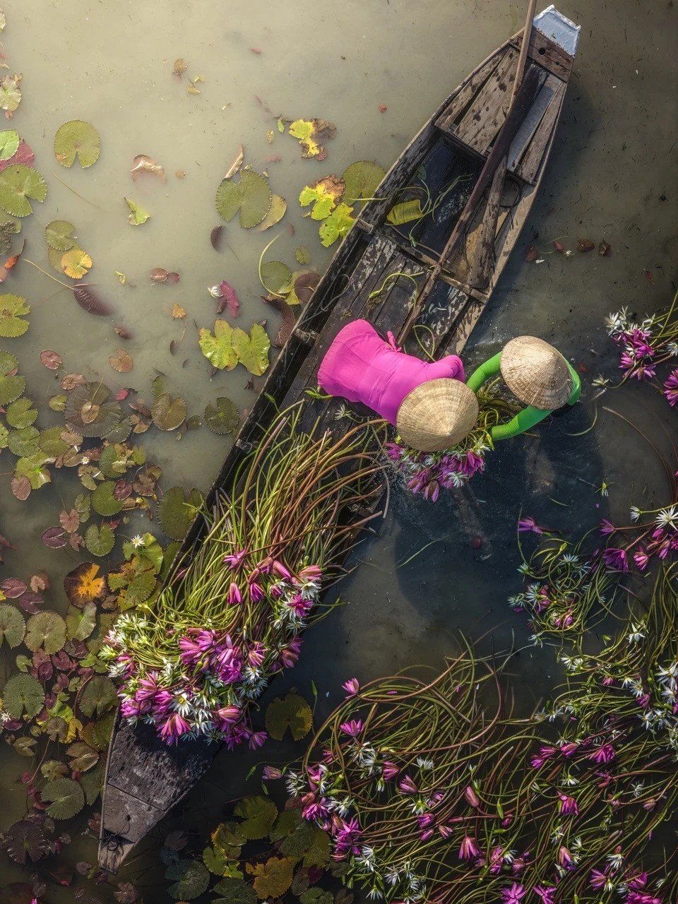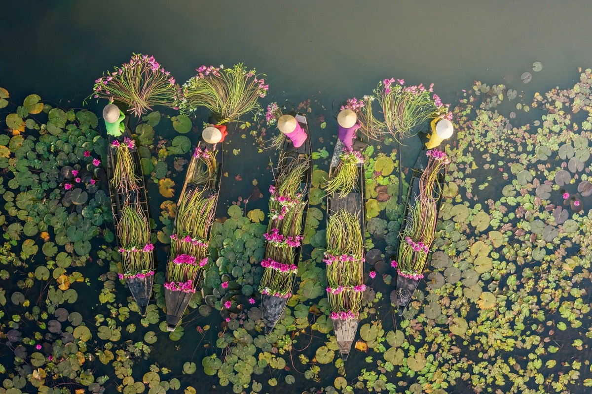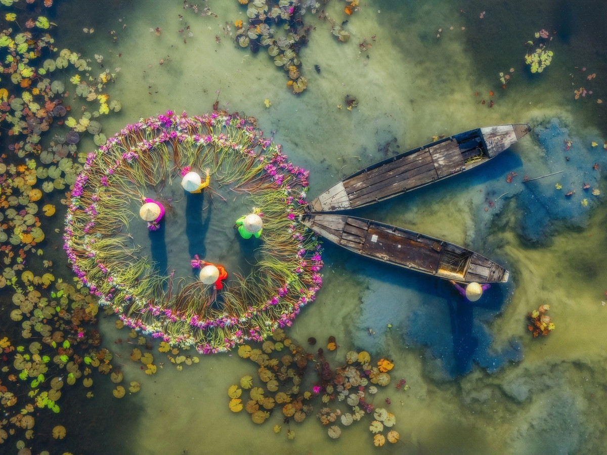 Nhìn từ trên cao, những thảm hoa trải dài như tấm lụa mềm phủ kín ao hồ, xen giữa là bóng dáng con người thoáng ẩn hiện trong làn sương sớm, khiến khung cảnh trở nên thơ mộng như một bức tranh thủy mặc. Ảnh Nguyễn Khánh Vũ Khoa