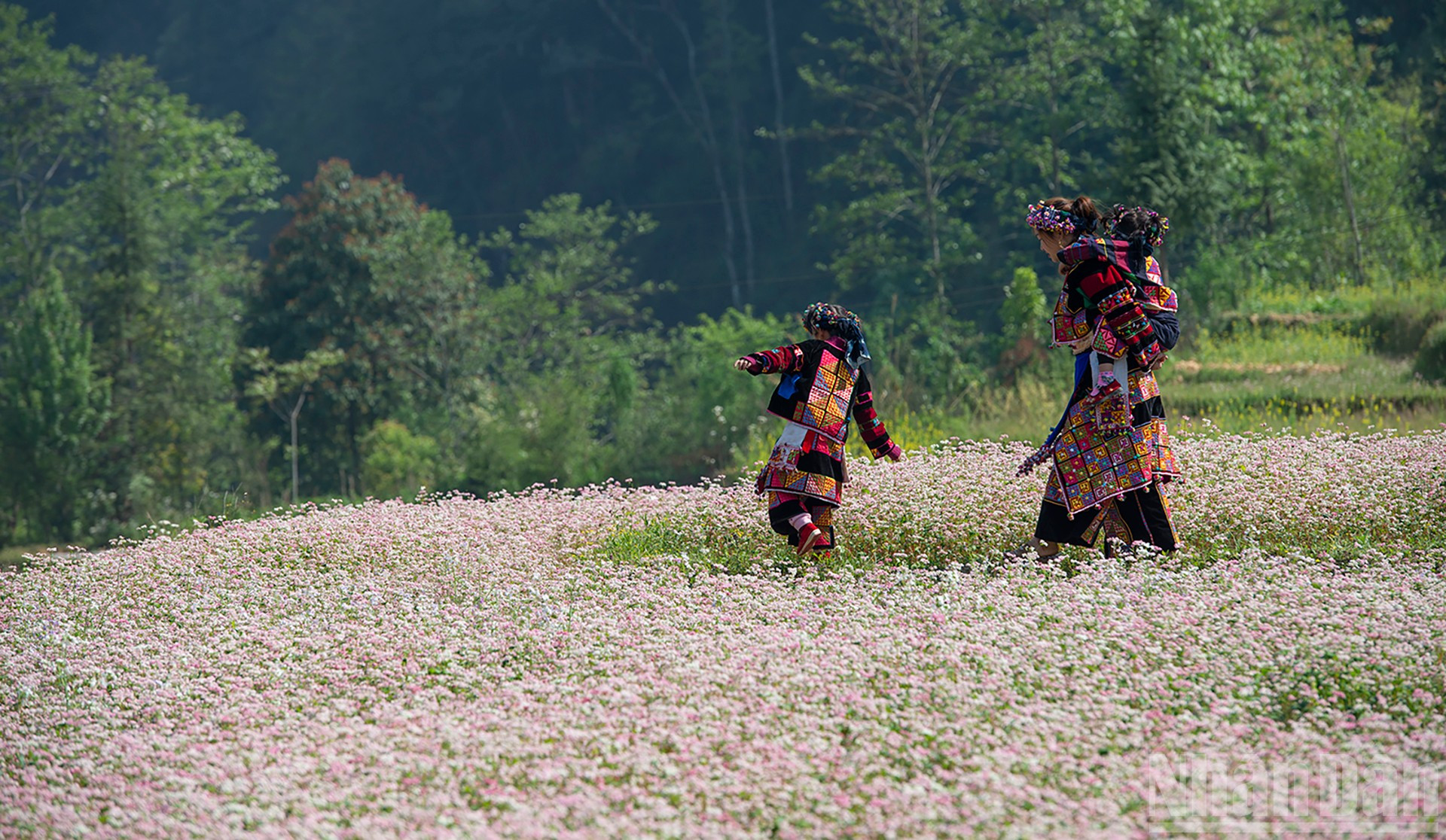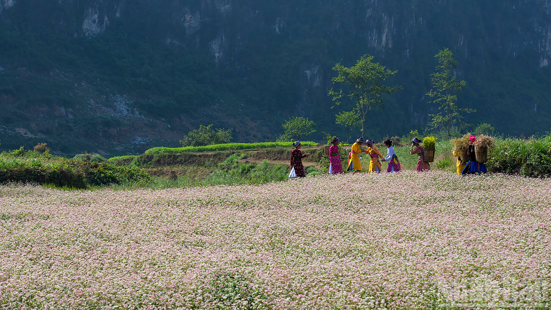 Thảm hoa tam giác mạch trải dài giữa núi rừng hùng vĩ. (Ảnh: Vũ Linh)
