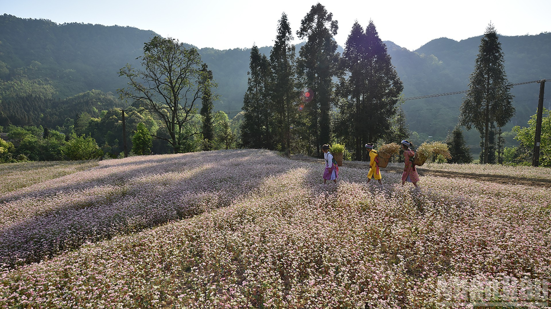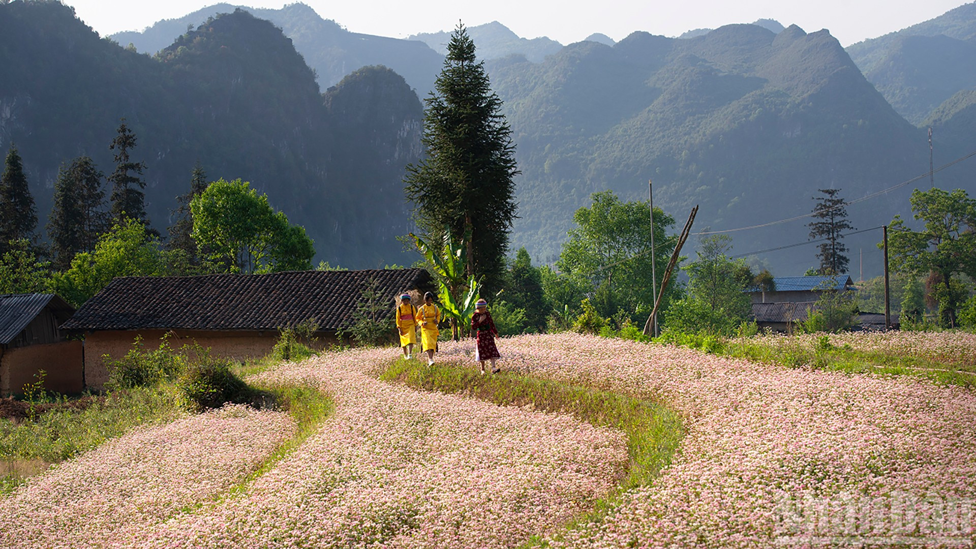 Dưới những tia nắng vàng rực rỡ, từng lớp sương mỏng dần tan để lộ thảm hoa tam giác mạch phớt hồng trải dài bất tận về phía chân trời, tạo nên vẻ đẹp hoang sơ và mềm mại giữa khung cảnh núi đá khắc nghiệt.